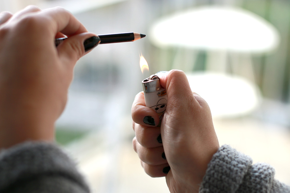 You want your eyeliner to last longer or did you even forget your eyeliner? To create a longer lasting eyeliner, just warm it up with a lighter and then apply. When I forget my eyeliner at home I can use mascara with a brush instead: just go with a brush over your mascara and draw an eyeliner. Works very well!