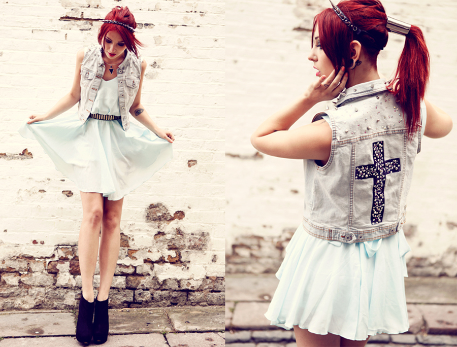 Ich trage dabei eine Gossengold Weste. Die hat hinten ein dunkelblaues Kreuz auf dem ganz viele Strasssteine und Nieten sind. Im übrigen klingt das nach einer sehr komischen Kombi, aber es passt wunderbar! Generell bin ich zwar kein Fan von Strass, aber die sind echt schön! Die haben irgendwie einen Perlmutt Effekt und erinnert dabei ein wenig an einen alternativen Meerjungfrauen-Look.