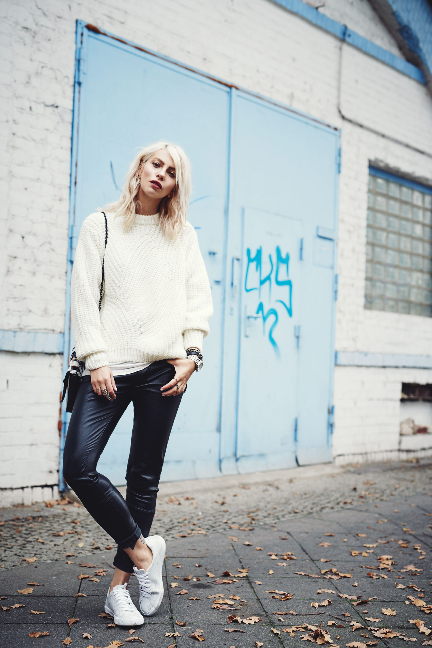 Mega gutes Outfit. Uns gefallen neben dem coolen Materialmix von Strick und Kunstleder vor allem die Veja-Sneakers. Wir sind bekennende Fans, weil dieses Label stylisches Design und Nachhaltigkeit perfekt unter einen Hut bringt. Top!