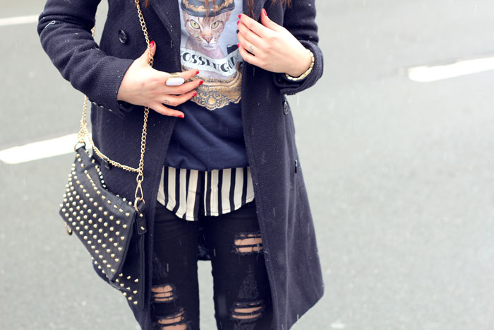 Once an old fashion rule said you should not combine dark blue und black – in my opinion you should definitely NOT follow it!! Highlight here is my sweater with the cat (wearing a hat!!!) from Gossengold!