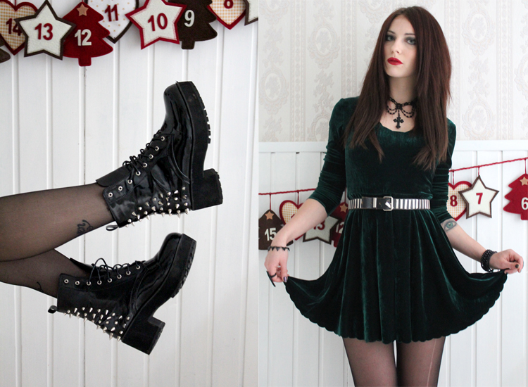 die schuhe sind so geil *_* insgesamt ein sehr hübsches outfit, und ich finde das grüne samt ist schon weihnachtlich ;> für den grinch müsste es ein richtiges fellkleid sein! ^^