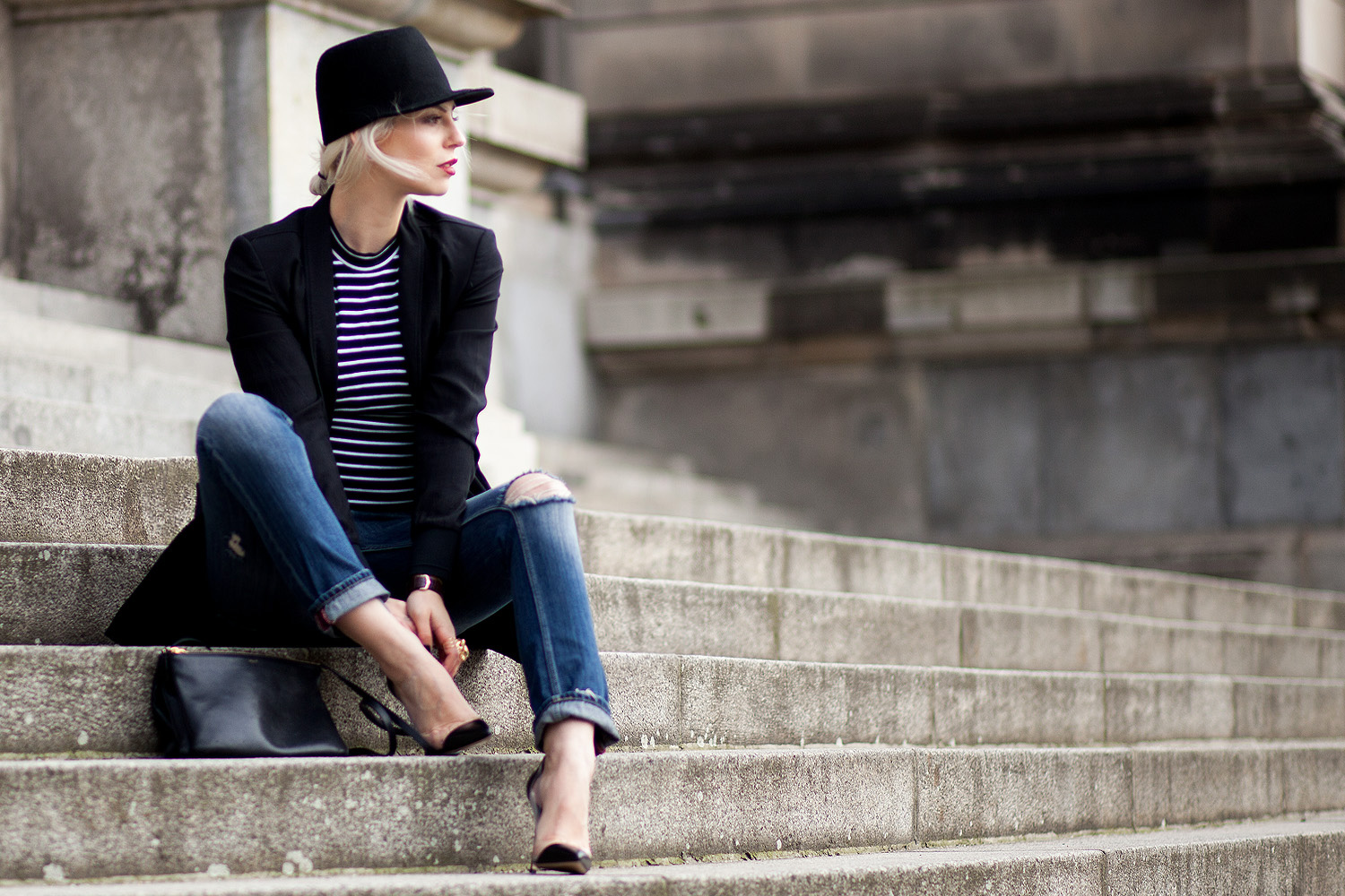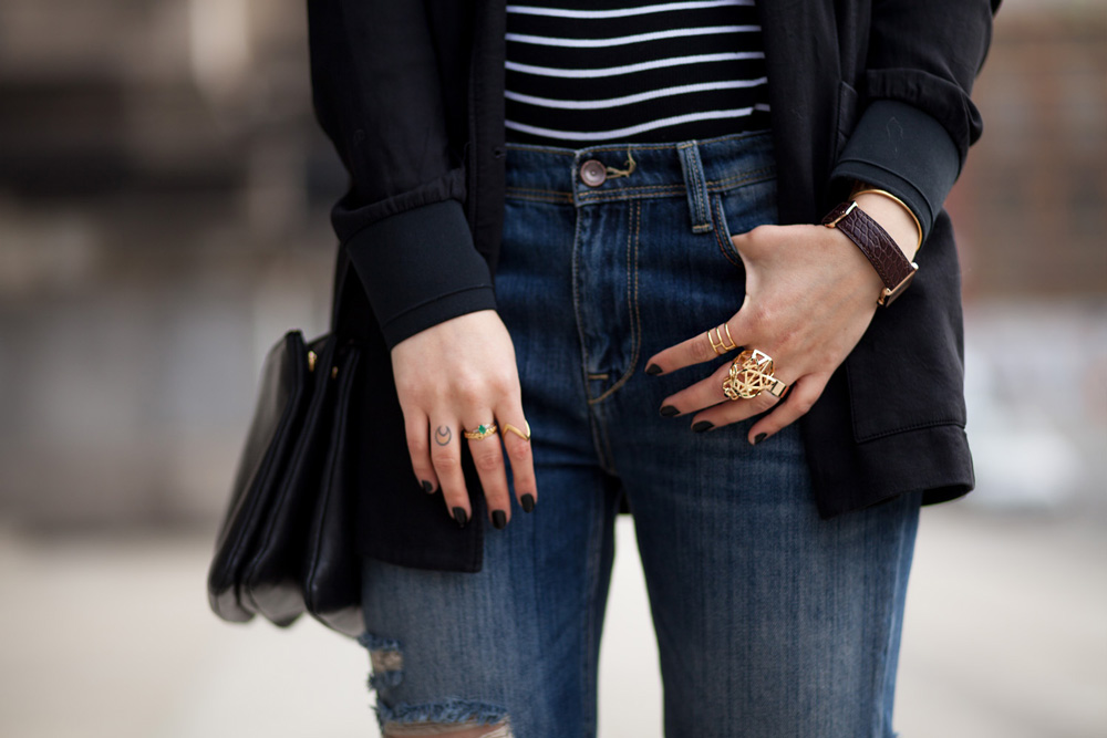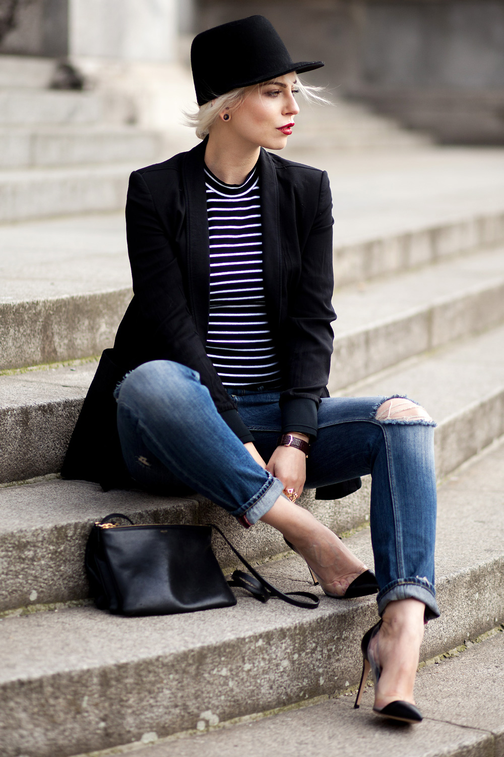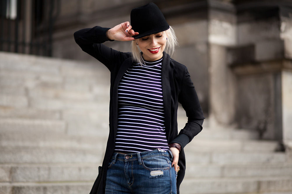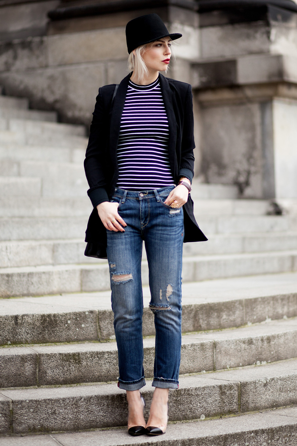 Ich bin absolut begeistert von deinem Outfit! Besonders angetan hat mit die Kombi aus Streifenshirt und Destroyed-Jeans!