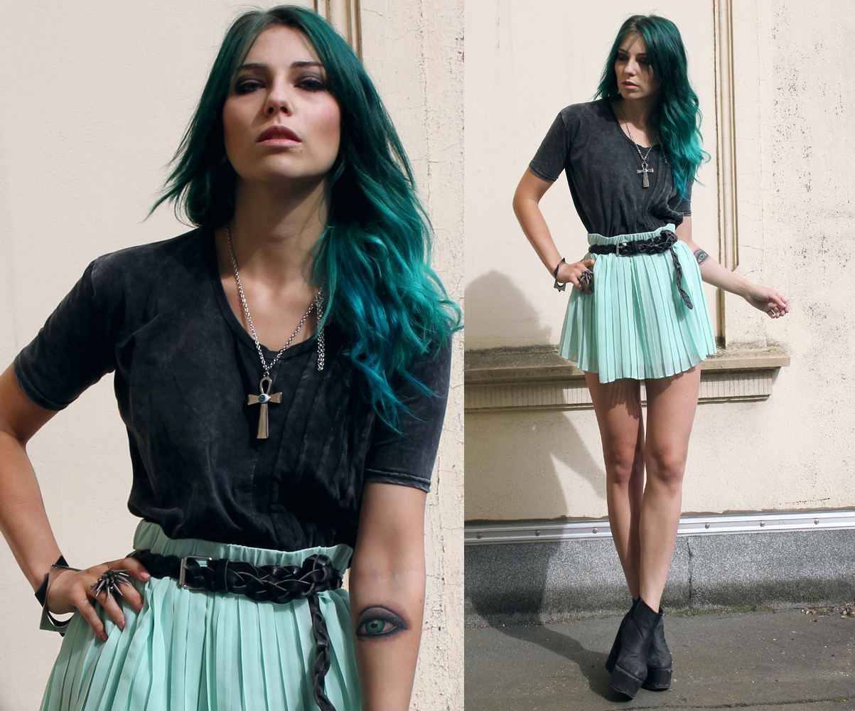 This look is AWESOME! I love the skirt and the pairing of those two colours is edgy and perfect! and the tattoo is obviously amazing **