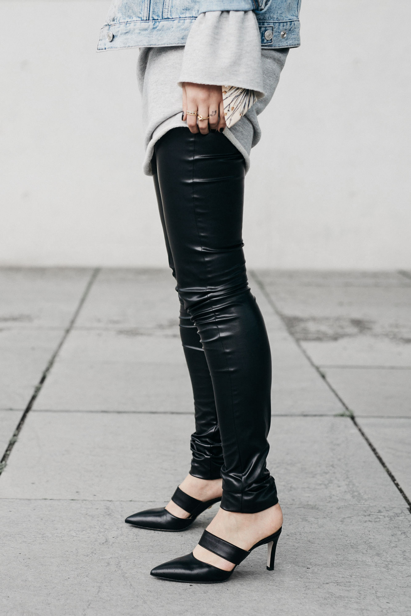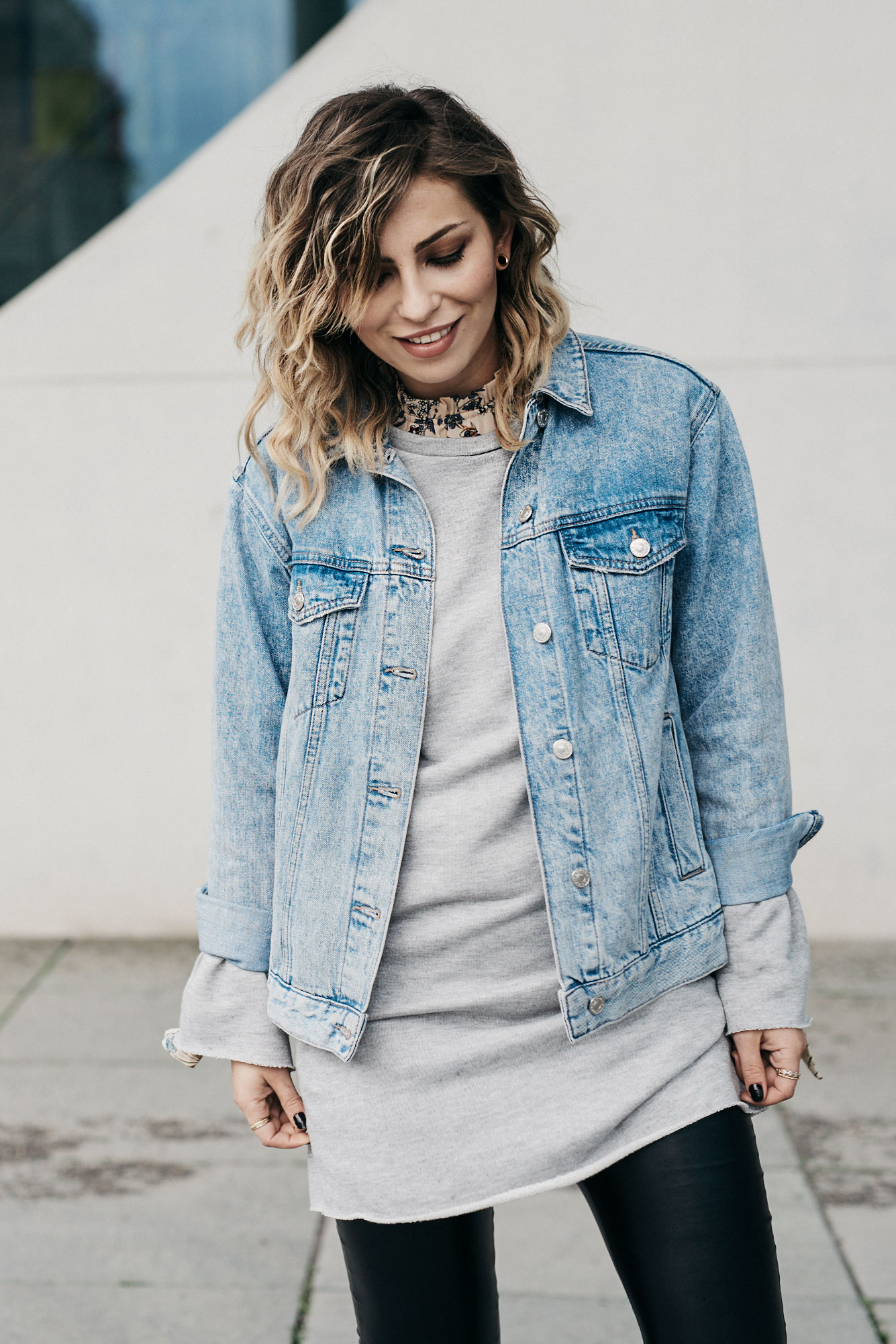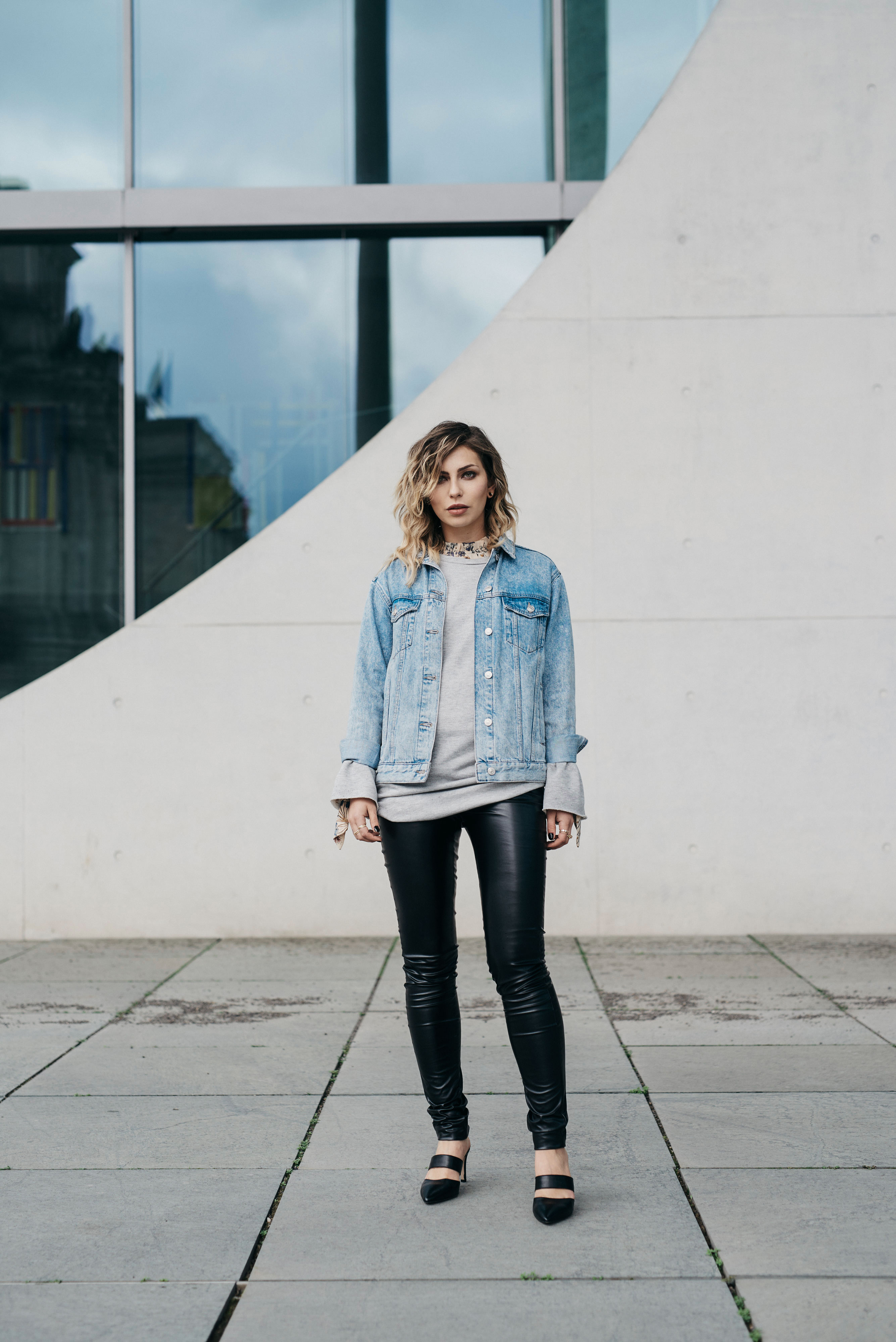 Firstly, I bought something very Masha-like. A bit casual but simultaneously a little bit grungy, since I chose a pair of fake leather trousers, a sweater and a denim jacket. For the moment of surprise, I combined it with a floral blouse that shows its face only now and then.