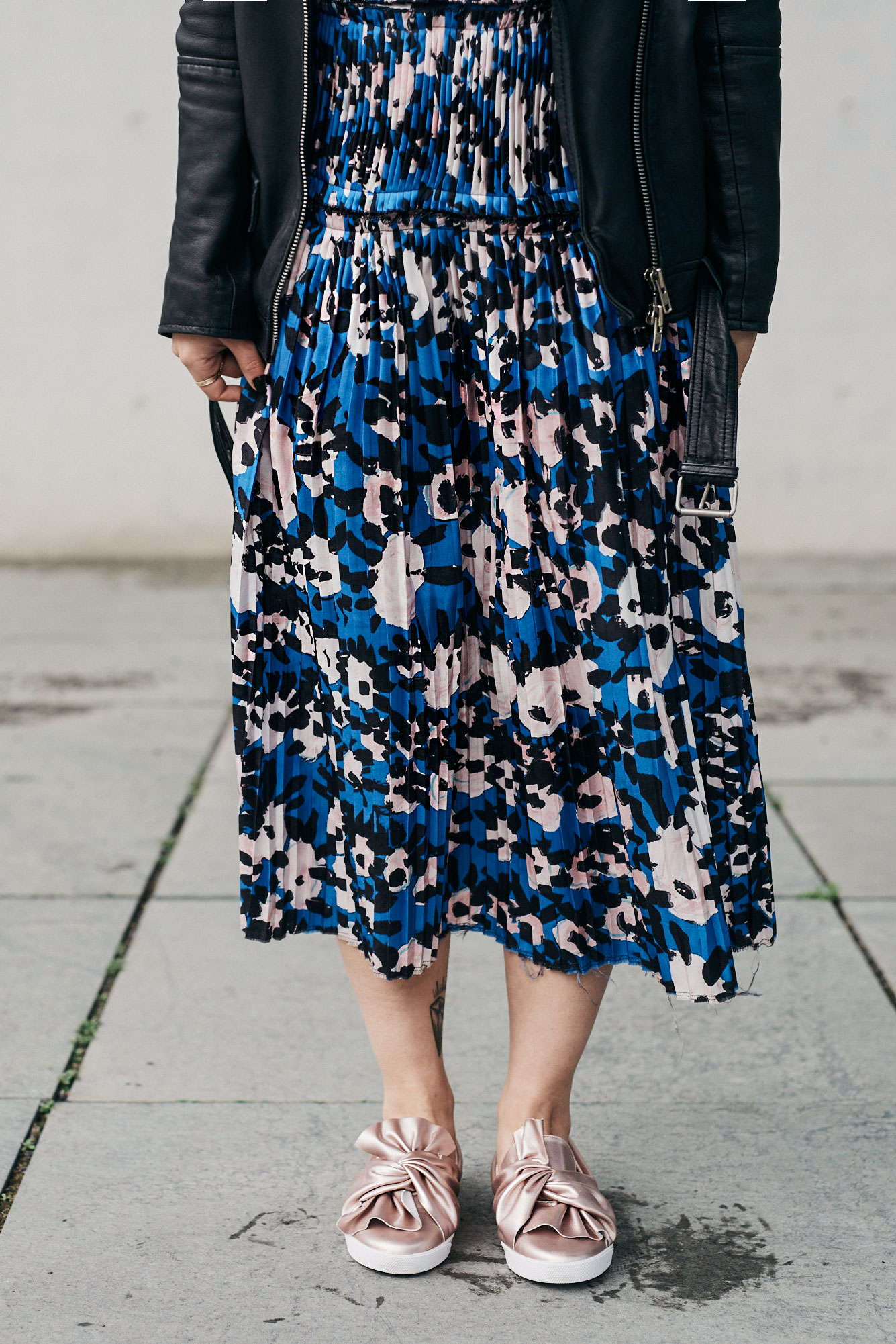The second look is much more girly. Basically, it’s a silk patterned silk dress, that whets one’s appetite for the upcoming spring season. The style of it is gorgeous and it impressed me especially with its pleated details around the upper half of the dress. It was love at first sight!   Still, it has to fit to my personal style so I don’t want it to look too girly. Therefore, I styled it with a leather jacket and sneakers.