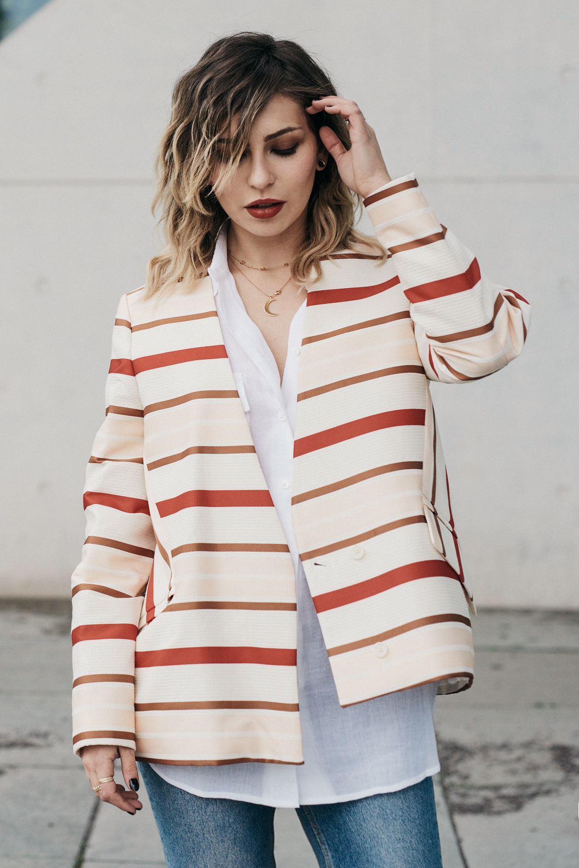 The last outfit is also very typical for me but the colors let it seem very summery. A sleeveless linen blouse that is an absolute essential in everyone’s closet. Combined with jeans, white sneakers and as a highlight I’ve chosen a very boxy jacket with colorful stripes. That’s totally my thing! It’s unnecessary to mention that this was also love at first sight and I don’t want to miss this item anymore.