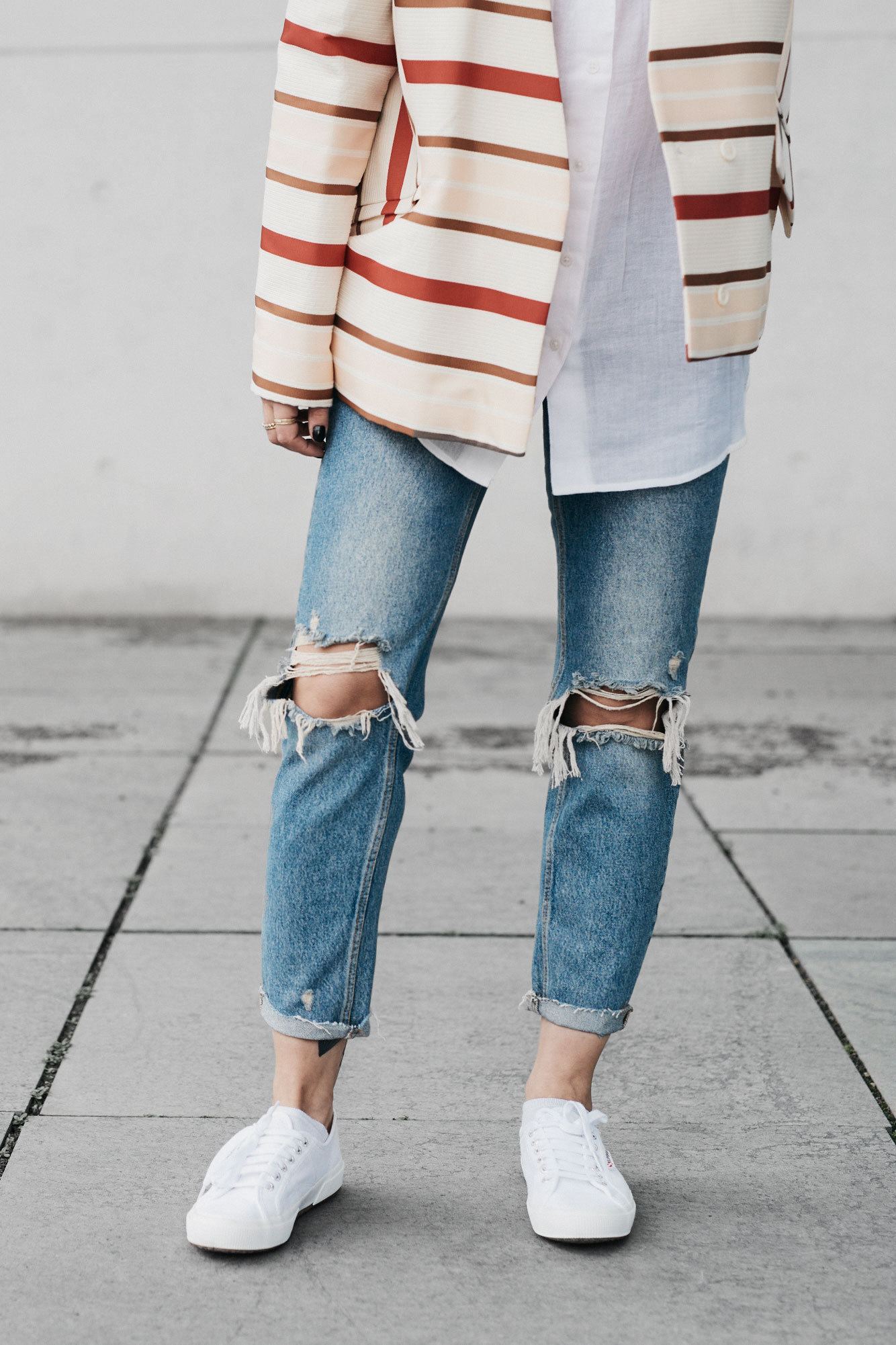 The last outfit is also very typical for me but the colors let it seem very summery. A sleeveless linen blouse that is an absolute essential in everyone’s closet. Combined with jeans, white sneakers and as a highlight I’ve chosen a very boxy jacket with colorful stripes. That’s totally my thing! It’s unnecessary to mention that this was also love at first sight and I don’t want to miss this item anymore.