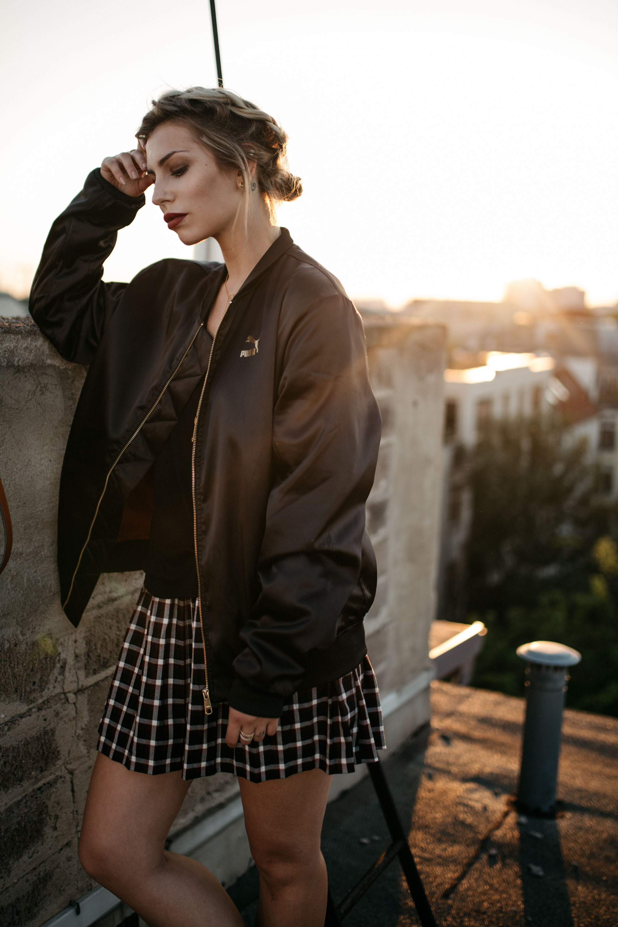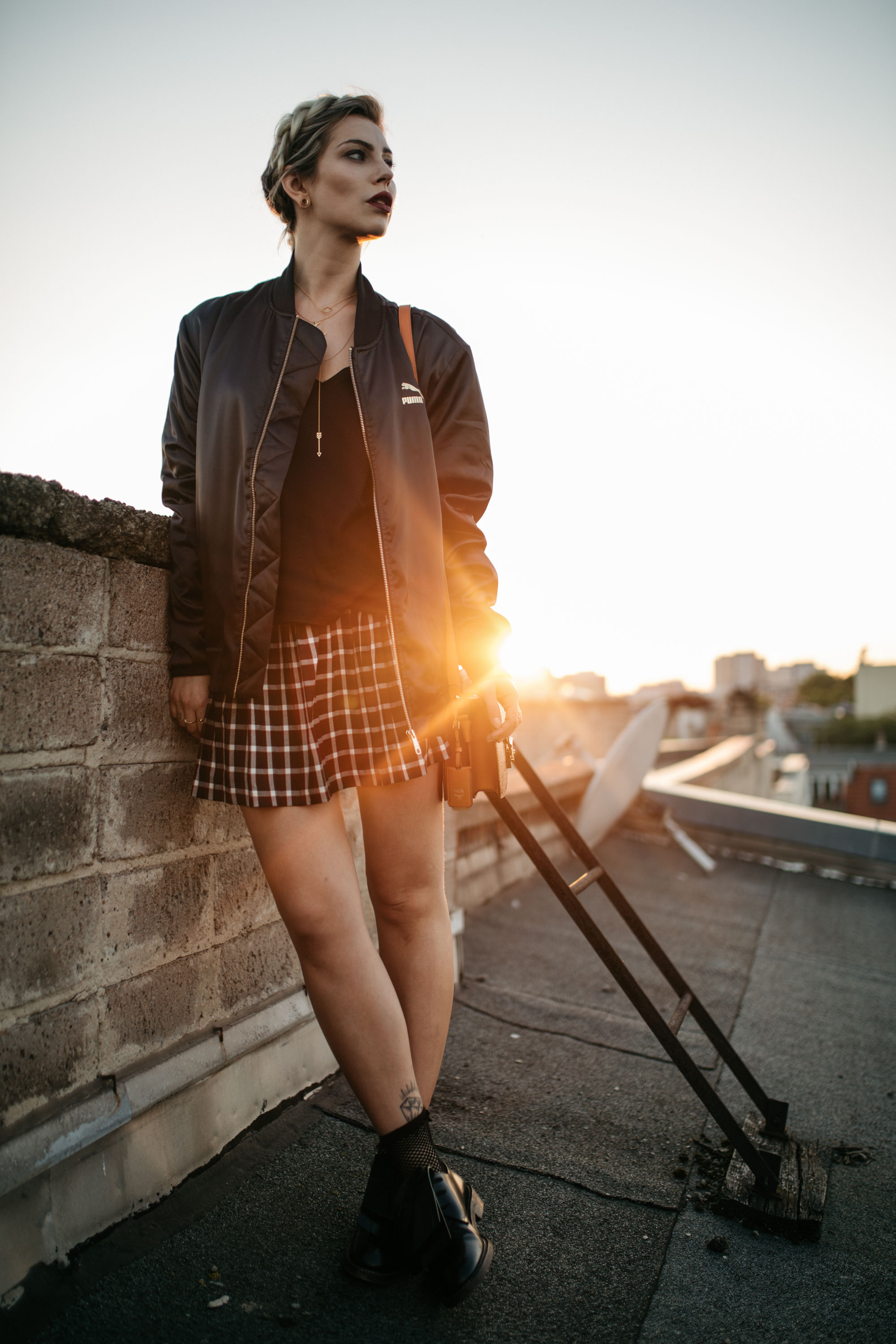 in this photo: jacket: Puma shirt: Anine Bing skirt: Monki shoes: Marni bag: MCM