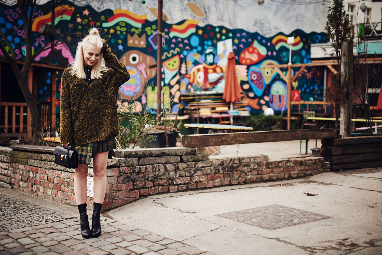 Zugegeben, meine Schulzeit ist schon lange her und dennoch stehe ich bis heute auf karierte Röcke und Collegestyles, insbesondere dann, wenn sie wie dieser Rock das gewisse Etwas haben, dank der Asymmetrie und der unterschiedlichen Stoffe. Hinzu kommt, dass das Outfit aussergewöhnlich bunt ist für meine Verhältnisse.