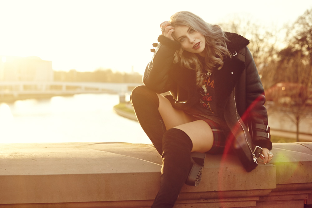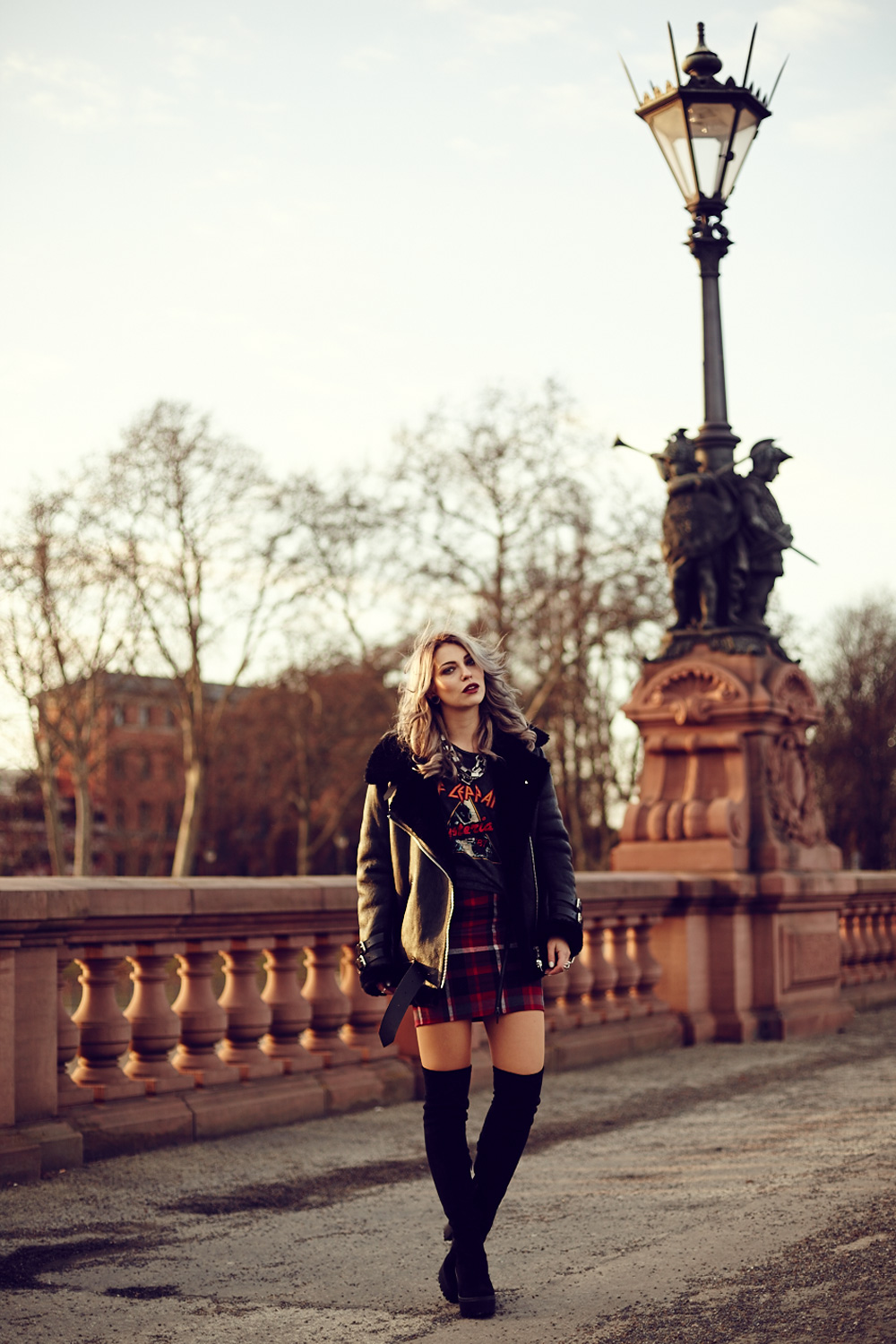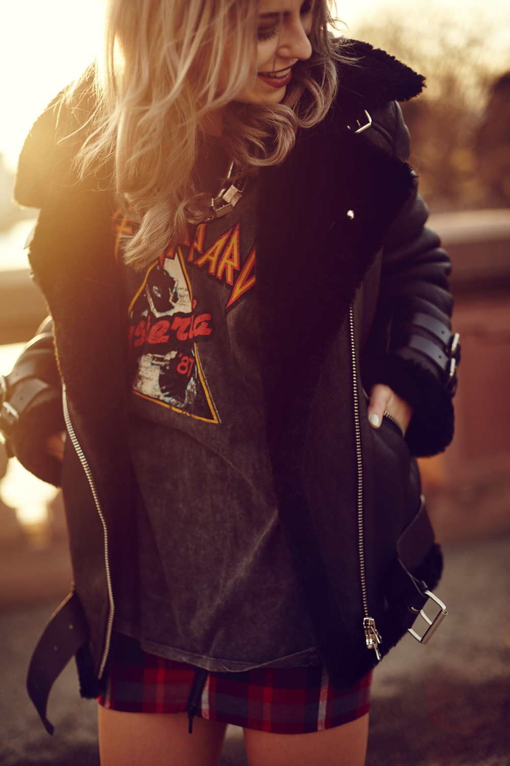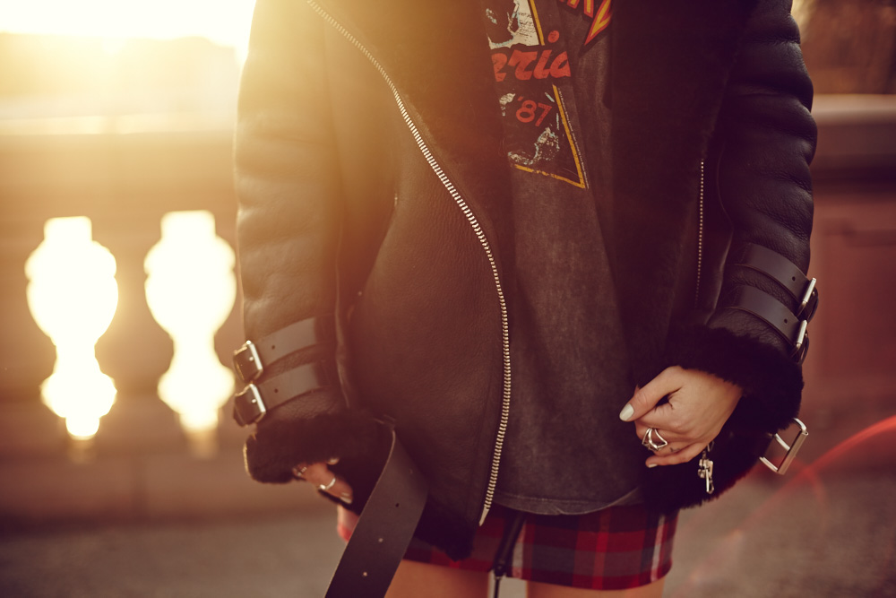 Nachdem meine Looks in den letzten Wochen stark vom grauen und tristen Wetter geprägt waren, hatten wir diesmal richtig Glück mit dem Wetter und konnten einen dieser sehr selten gewordenen Sonnenuntergänge genießen. Ich mag den Winter und das kalte Wetter an sich ganz gern, allein schon, weil ich Wintersachen lieber mag, als Sommersachen, aber diese grauen Wolken nerven einfach. Doch nicht nur das Wetter ist anders, als gewohnt, auch der Look fällt heute besonders sexy aus, aber das ist ja auch mal ganz nett zur Abwechslung. Zugegeben, die Leute haben teilweise echt ein wenig komisch geguckt (schaff das mal in Berlin!), aber ich mag den Look echt gerne und er erinnert mich an meine früheren runtergerockteren Looks, als ich im Grunde nur so rumgelaufen bin. Erinnert sich noch Jemand an die Glitzer-Jack-Daniels-Zeiten? Das hier ist quasi die erwachsenere Version davon mit meiner Acne Jacke, in die ich unendlich verliebt bin. Sie ist auch der Grund warum ich mich neuerdings über jeden bitterkalten Tag freue. So macht Winter Spass! My latest looks were all shot in the gray and dreary weather, but this time we were really lucky and enjoyed one of the rare sunsets of the last months. But not only the weather is different than usual the look today is more sexy. I hope you like that! It reminds me of my old style, which was way more grungy. This is something like the grown up version of past-Masha with my new Acne jacket, that I totally love. This jacket is the reason why I’m happy about every cold day recently. I love winter!