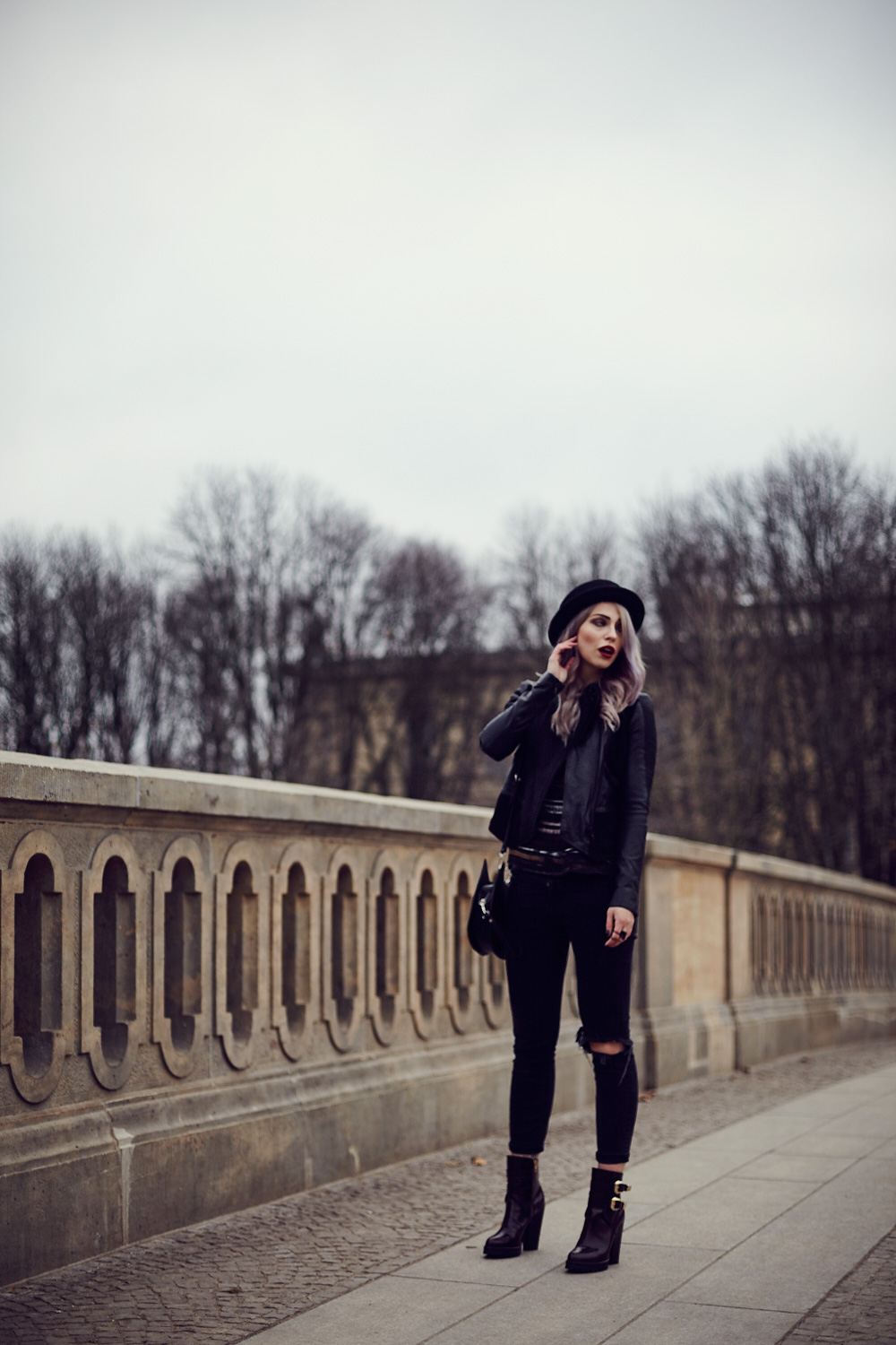 Zugegeben, für eine Lederjacke ist heute nicht das richtige Wetter! Generell habe ich irgendwie das Gefühl, dass der Herbst dieses Jahr irgendwie auf der Strecke bliebt und der Sommer fast nahtlos in den Winter übergegangen ist. Geht euch das irgendwie auch zu schnell mit dem Winter, oder bilde ich mir das nur ein?? Ich habe allerdings auch mitbekommen, dass es in Berlin grade genauso kalt ist wie in Russland, und kälter als in Stockholm oder Helsinki. Glaube ich sofort!! Diesen Look habe ich zwar auch in der Kälte geschossen, allerdings hatte ich da noch die enge Lederjacke drunter, was übrigens ein cooler Trick ist, wenn man irgendwohin geht, wo man irgendwie „angezogen“ aussehen möchte, aber keine Lust hat draussen zu frieren. Muss ich halt alle meine Übergangsjacken so tragen – als Jacke unter einer Jacke. Okay, maybe it’s not the perfect weather for a leather jacket, yeah maybe it’s too cold, way too cold. Actually it feels like the autumn was skipped this year. It was summer first and from one day to another it was winter. Am I the only one with this feeling? However, I found out, that these days in Berlin it’s as cold as in Russia, I mean it’s colder than Stockholm or Helsinki!! WTF! But of course I want to wear my autumn jackets, too so I just decided to wear a leather jacket under a “real” jacket. Maybe I should do it always like that: wear a jacket under a jacket.