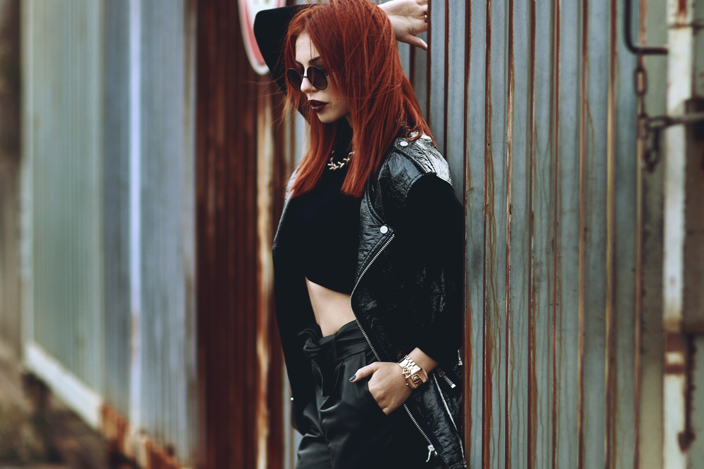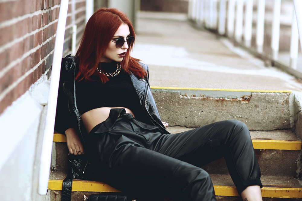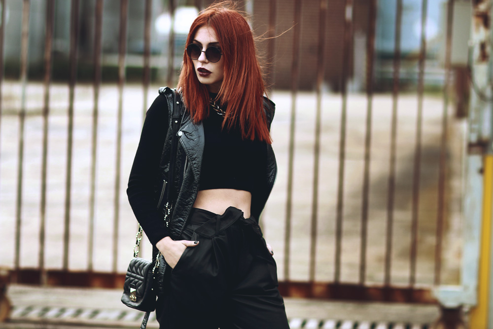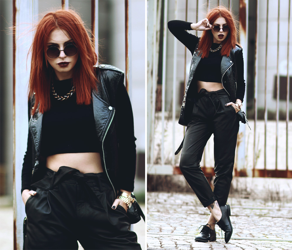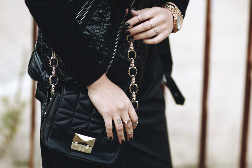Black in Black ist wie immer mein Lieblingslook – insbesondere für den Montag! Ausgangspunkt dieses Looks war meine neue Lederhose, die ihr garantiert nicht zum letzten Mal sehen werdet und in die ich mich bereits seit Paris verliebt habe. Sie ist aus ganz weichem Leder, allerdings habe ich festgestellt, dass sie auf Fotos nicht so gut aussieht, wie in echt. In Wirklichkeit hat sie sich nämlich direkt zu einer meiner Lieblingshosen gemausert und weil man sie sowohl weiter oben, als auch auf der Hüfte tragen kann, habe ich mich für die erste Variante entschieden und das Ganze mit einem Cropped Top kombiniert. Allerdings war es arschkalt und ich hatte eigentlich dazu eine Bomberjacke an, aber auf den Fotos sah das alles so aufgeplustert aus (in echt gar nicht!), dass ich die Jacke kurzerhand weggelassen habe und mich stattdessen fürs Frieren entschieden habe. Neuerdings hat sich auch mein Repertoire an Lieblingstaschen erweitert, nämlich um die kleine Karl Lagerfeld. Spätestens jetzt habe ich nun echt alle Größen beisammen an schwarzen Handtaschen und wider Erwarten trage ich sie echt oft, denn obwohl ich dachte, dass mir das doch eine Nummer zu klein ist, bekomme ich trotzdem alles rein, was ich brauche. Krass oder? :) Black in Black is, as always, my favorite outfit – especially for my Monday’s post! The starting point of this look was my new leather pants, that you won’t see the last time on me – I guarantee! I wanted it for months, actually since I’ve since Paris, and I’ve fallen in love with it immediately! It’s made out of very soft leather, but I have found out that it doesn’t look as good in pictures, as in real. Recently, also my repertoire of favorite bags has expanded with the small Karl Lagerfeld bag. I guess now I have all sizes of favorite bag, but to be honest I didn’t expected to wear this little bag that often, but I do. First I thought it’s too small, but everything I need fits insight. Crazy, isn’t it? :)