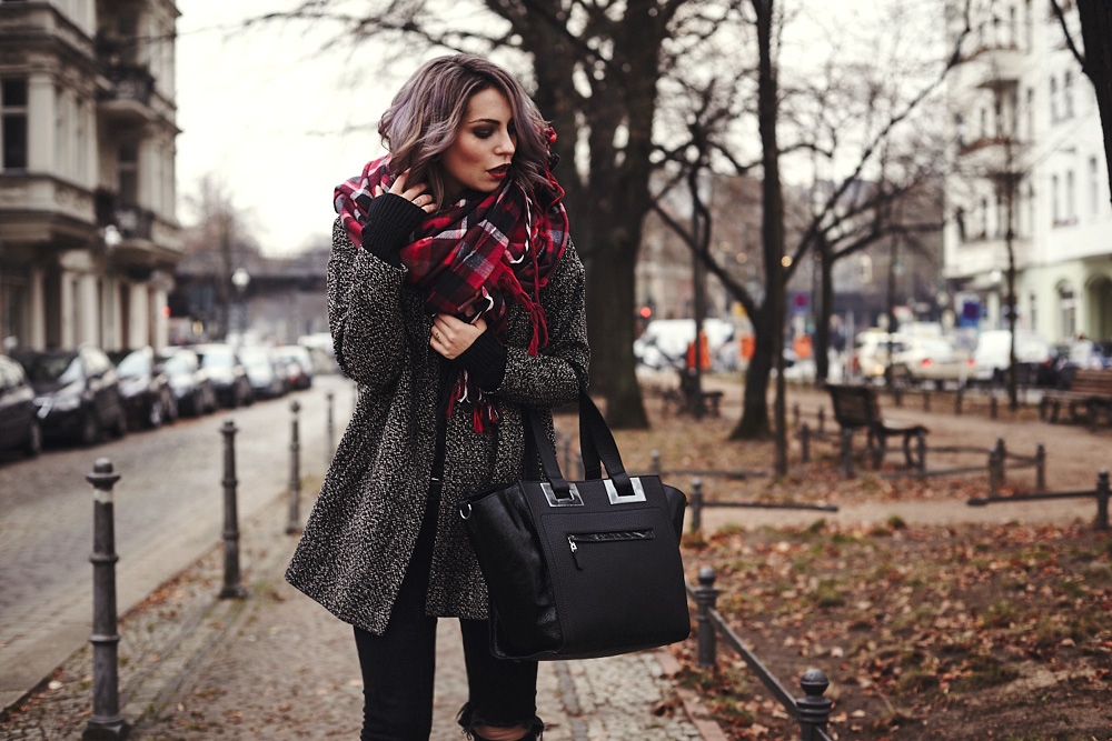 Gute Nachrichten! Endlich ist die Around the World Bag, die Anni, Sarah, Anne und ich designed haben im Handel und auch online erhältlich!!! Ich glaube man kann ganz gut erkennen, dass sich die Persönlichkeit jeder Bloggerin darin wiederspiegelt und ich bin wirklich sehr sehr stolz auf das Resultat! Sie ist groß genug, das der halbe Haushalt reinpasst, sieht aber trotzdem nicht nach Reisetasche aus. Was ich auch ganz toll finde sind die Gunmetal Elemente – die passen nämlich einfach zu allem! Ihr werdet die Tasche wohl sicherlich noch öfter an mir sehen :)   Der Rest des Outfits ist heute ebenfalls wieder etwas schicker, denn ich hatte mal wieder Lust auf hohe Schuhe und einen langen Blazer. Drunter trage ich einen grobmaschigen Pullover und darüber einen karierten Poncho, den ich als Schal umfunktioniert habe (sehr viel Schal!).   Übrigens: ich werde super oft gefragt “ob mir denn nicht kalt sei” – die meisten denken sich einfach nur “russische Gene…” und fragen gar nicht erst, aber die, die sich trauen, denen verrate ich meist auch meine Tricks. Den mit der doppelten Strumpfhose kennt ihr ja (bringt wirklich was!) naja und jetzt kommt ein weiterer, etwas peinlicher, aber sehr wirksamer Tipp: ich trage bei so luftigeren Sachen nicht selten enganliegende Tops aus Wolle oder eine sexy Radler aus Wolle unterm Rock, sogenannte Wollunterwäsche. Man könnte fast sagen ich schwöre auf Wollunterwäsche. Das sieht zwar alles andere als sexy aus, aber bei dem Wetter habe ich auch ehrlichgesagt nicht unbedingt das Bedürfnis mich auszuziehen und mal eben mit Jemandem ins Gebüsch zu gehen. Muss ja auch nicht immer sexy sein. Good news!! Finally our Around the World Bag, designed by Anni, Sarah, Anne and me is out now! You can get it in the stores and online :) I’m soooo proud of it and I think the style of every blogger makes each part of the bag so special. It’s big enough for all your stuff and the gun metal elements match to gold, silver and copper. Probably you’ll see this bag often enough on me.   The outfit today is more chic and after wearing flats and comfy boots all the time I wanted to wear high heels again, because nothing looks as good as a beautiful pair of high heels. I’ve combined it with a long blazer and a poncho, that works as a scarf, too.