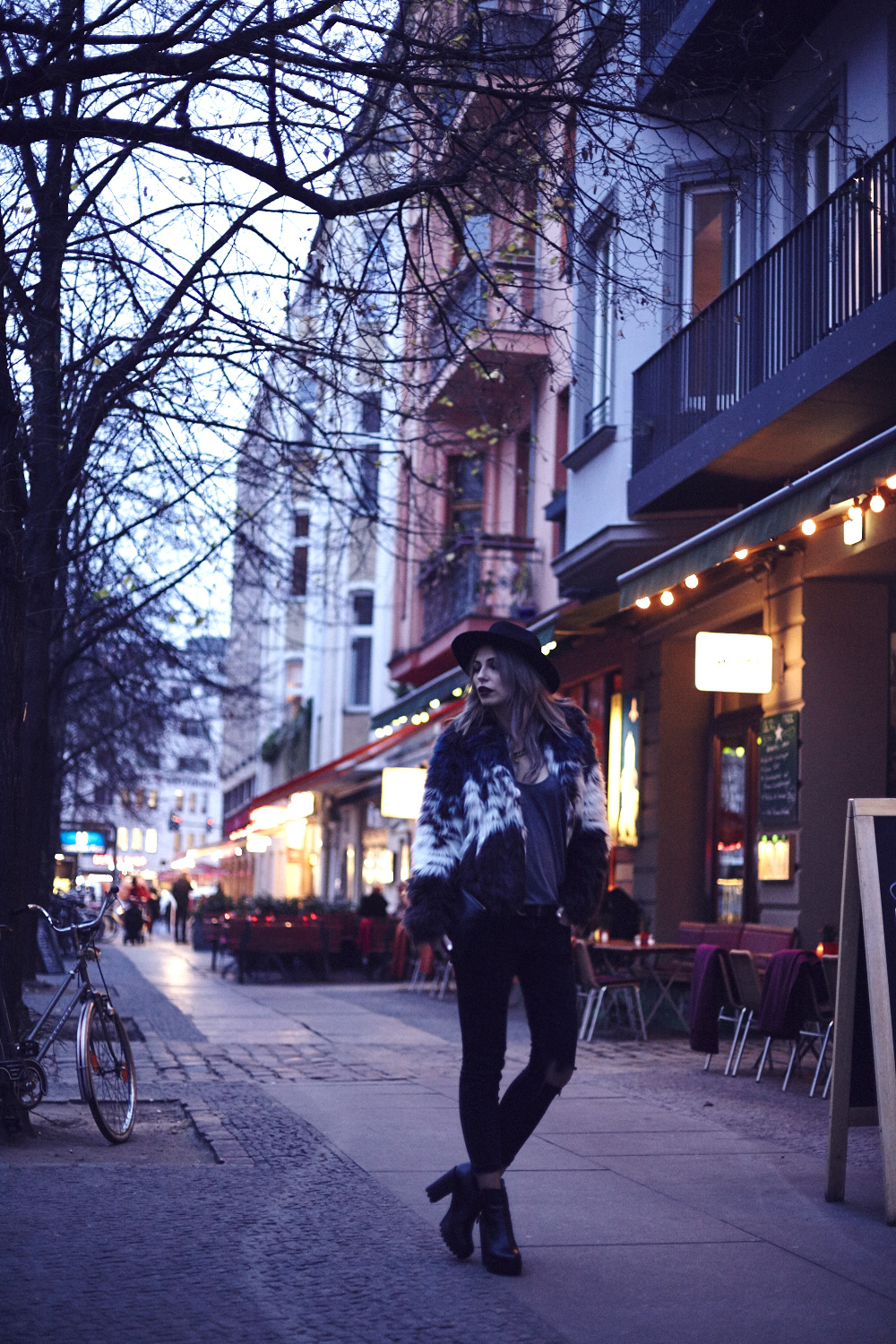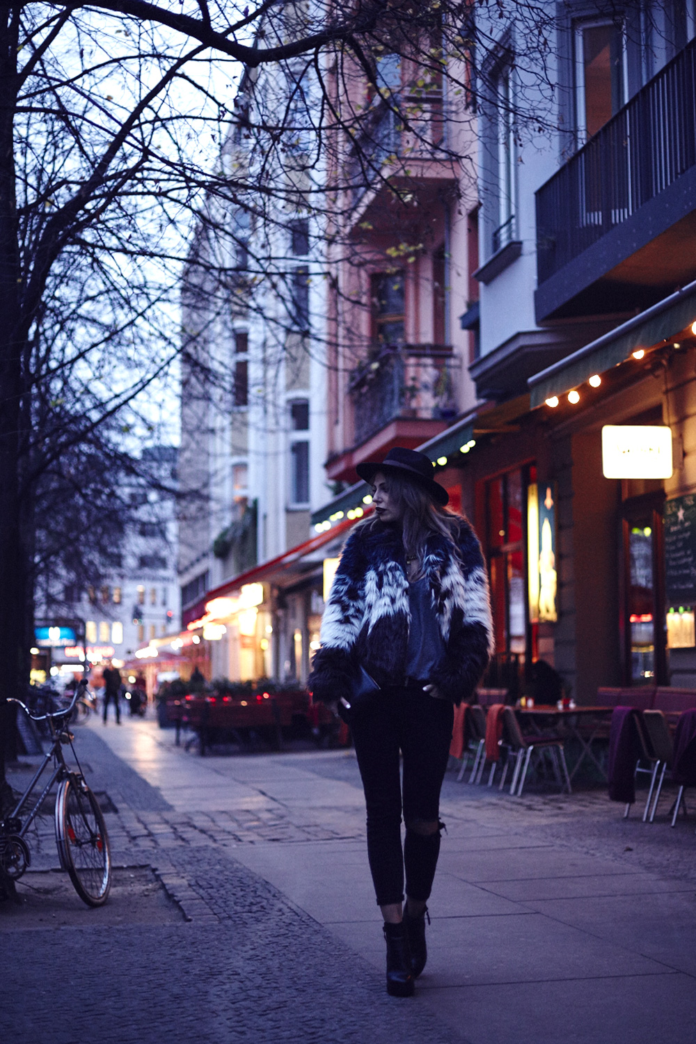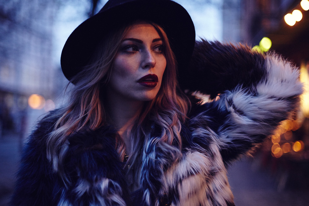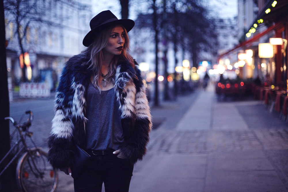 Ich finde es grade echt ziemlich scheisse, dass es so früh dunkel wird, bzw. habe ich seit einigen Tagen das Gefühl, dass es schlichtweg seit einigen Tagen gar nicht mehr richtig hell wird. Das macht die Sache mit den Outfitfotos zur Zeit natürlich ein bisschen kompliziert, aber hey, dafür muss ich in Zukunft dann kreativ werden :)   Heute gibt es erstmal ein Outfit im Dunkeln, aber nicht einfach irgendeins, sondern ein richtiges Lieblingsoutfit, das ich für ein besonderes Video getragen habe, das ihr dann morgen seht! Das ist immerhin das Gute am Schmuddelwetter: ich kann meine liebsten Winterkombis auspacken und diesem Fall ist das schwarze, kaputte Jeans, Felljacke und Feodora Hut! Wirklich eine unschlagbare Kombi! I hate it that it’s getting dark so early, and on some days it doesn’t get light outside at all. Of course that makes taking outfit pictures tricky, but hey, it’s a good reason to get more creative the next weeks.   So today I have shot an outfit in the dark, but not just any outfit, but one of my faorites, that I’ve worn in a video, that I’ll show you tomorrow!