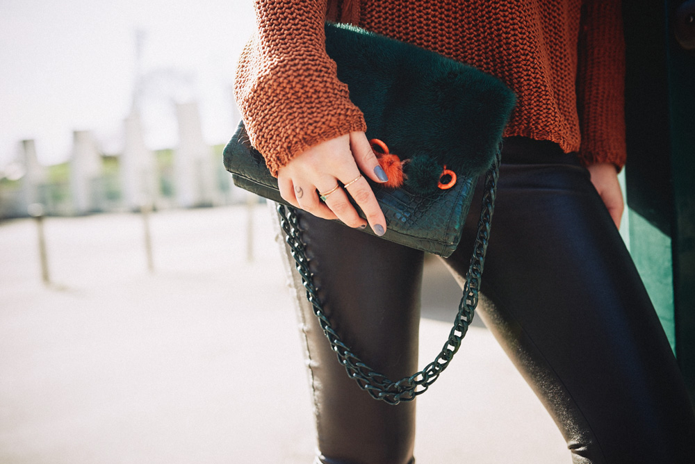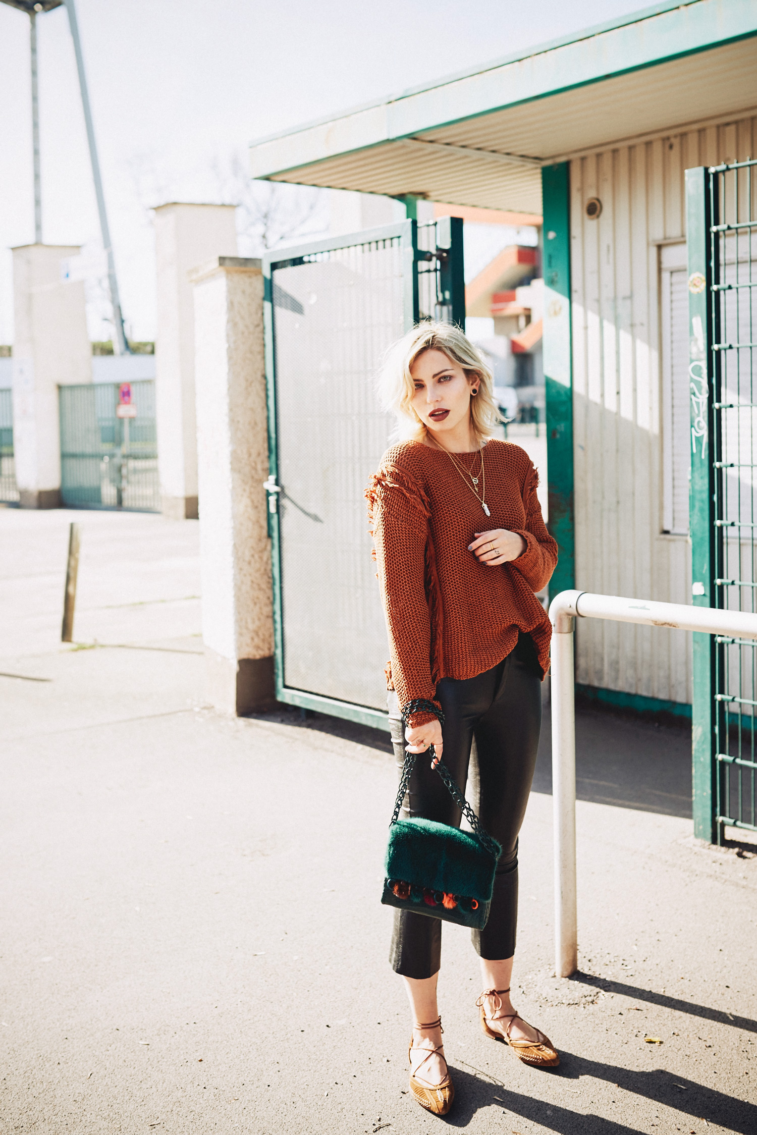 Während ihr diesen Text hier lest, bin ich vermutlich grade im Flugzeug, ziemlich müde und auf dem Weg in die USA! Meine erste Station wird Dallas sein, wo ich an einem Event für Blogger teilnehme, anschließend geht es nach LA! Dort geht’s dann zum Coachella Festival! Ich war letztes Jahr schon dort und es hat einfach tiiiierisch Spass gemacht, deswegen bin ich dieses Jahr wieder dort und freue mich schon drauf meine Freunde wiederzusehen.   Dass ich schon ganz aufgeregt bin und in den letzten Tagen tief in meine Festival Planung versunken war sieht man auch meinen Outfits an, denn obwohl die Festival Saison noch nicht angefangen hat bin ich schon voll in dem Thema drin! Den Anfang macht das Outfit heute mit dem leichten Pulli mit den ausgefransten Säumen und den flachen Schnürballerinas. Dazu trage ich eine flaschengrüne (Lieblingsfarbe) Tasche mit Bommeln. Ich weiss auch nicht, aber in dieser Saison habe ich Bommeln für mich entdeckt und liebe dieses verspielte Detail für ein bisschen Boho Feeling auch in Berlin.