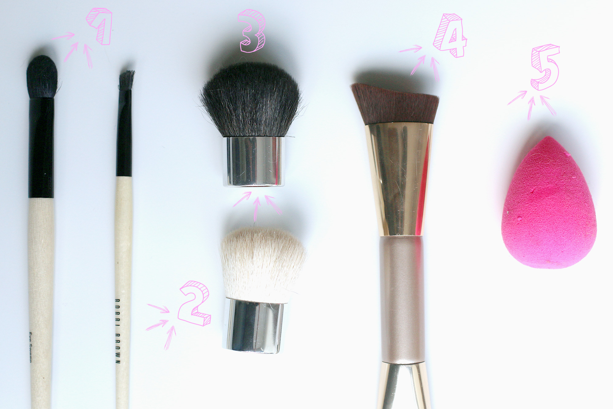 pinsel-guide-2   1. The highlighter brush The eye sweep is actually a great eye shadow brush, but I use it as a highlighter. It has the perfect size to highlight specific areas and enables me to apply highlighter powder as precisely as eye shadow. This one’s one of my favorites, as I can use it for so many different things.   2. The eyebrow brush I hardly use this one at the moment, because I tend to go for an eyebrow pencil. Nevertheless, the brush works really well with eyebrow cream and helps to apply color evenly despite the little hairs.   3. The travel brush Whenever I’m on the road I try to travel lightly. Instead of bringing rouge and bronzer brushes I just pack one smaller brush for both jobs.   4. The tapered brush I used to really like tapered bronzer brushes for my cheekbones. It helps to apply bronzer evenly, and is really easy to use, which makes it a good choice for beginners. Be careful though, these brushes tend to pick up quite a lot of color!   5. The makeup-egg When I use foundation I either apply it with my fingers or with a special sponge that spreads the color more evenly. These little makeup sponges are also available in smaller sizes for concealers and are very practical whenever you want to avoid applying too much.