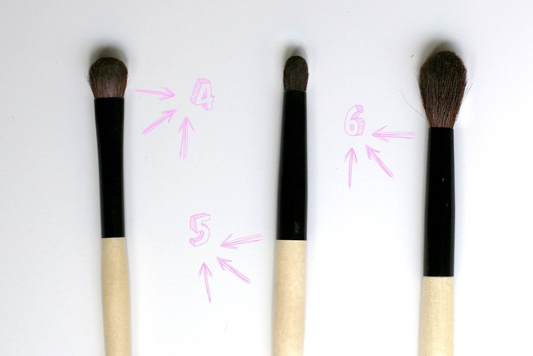 For my eyes I have various brushes as well, depending on the specific task.   pinsel-guide-4   4. The eye shadow brush This brush is relatively broad and thick, which makes it ideal to apply eye shadow over larger areas.   5. The eye smudge I use the eye smudge brush for the crease.   6. The eye blender I use the eye blender brush for two tasks: firstly to blend the eye makeup, secondly to apply and blend powder precisely under the eyes. The brush ha an elongated shape, a rounded tip and is very soft. I such a way it does not pick up too much color and functions more as a blender.