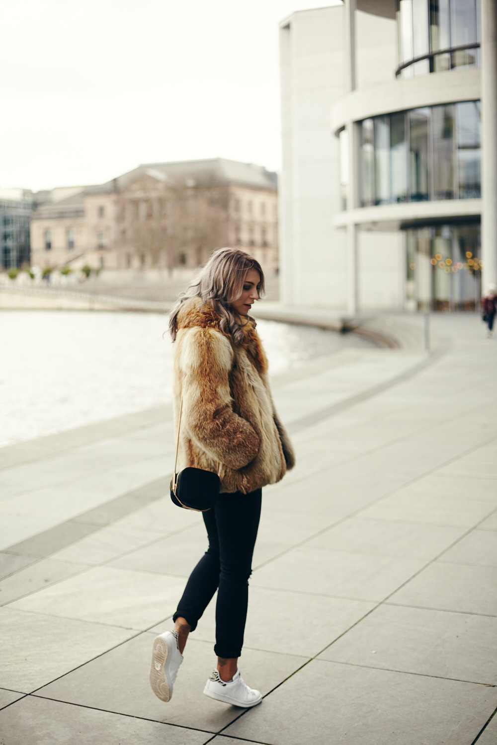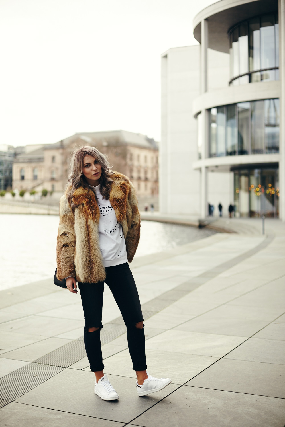 Nach ein paar echt entspannten Tagen, an denen ich endlich ein bisschen ausruhen und schlafen konnte, komme ich langsam wieder in einen Arbeitsrhytmus rein. Das finde ich immer am schönsten am Anfang des Jahres: diese Ruhe vor dem Sturm…   Entsprechend entspannt ist auch mein Outfit heute: Sweater, Jeans und meine neuen Lieblingssneaker. Mit den Stan Smiths habe ich nämlich schon seit einer ganzen Weile geliebäugelt, aber bisher nervte mich immer dieses grün an den Schuhen. Jetzt gibt es aber eine Special Edition mit vielen abgefahrenen Varianten (bei Footlocker) und u.a. auch dieses mit Zebramuster – I like!! Meine Schwäche für Sneaker habe ich sowieso erst vor etwas mehr als einem Jahr entdeckt und seitdem kommen immer mehr und mehr Modelle hinzu, aber ich glaube kein Modell wollte ich bisher so dringend wie die Stan Smiths, die sehen halt gleichzeitig auch so clean aus. Damit das ganze Outfit nicht zu casual wird trage ich dazu (Fake)-Fur und eine Crossbody Bag mit goldenen Details, oder wie mein Freund (etwas spöttisch) meinte: typisch Berlin-Mitte. After some really relaxing days I’m slowly getting back into a working sequence. I think that’s always the best at the beginning of the year: the calm before the storm …   Accordingly relaxed is today’s outfit: sweater, jeans and my new favorite sneakers. I’ve already wanted a pair of Stan Smith for a long time, but this limited edition with the zebra print is just perfect! They’re not too sporty, but clean. I’ve combined the basics with with faux fur and a cross body bag with golden details so it’s not too casual.