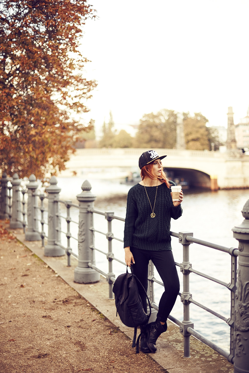 Sobald es kälter wird fahre ich fast sofort die Gemütlichkeitsschiene und an einem schönen Herbsttag gibt es einfach fast nichts Schöneres, als einen schönen Herbst Spaziergang zu machen. In unserem Fall sind wir erst am Hackischen zum Starbucks gelaufen, haben uns einen Kaffee geholt und ganz gemütlich die Museumsinsel erkundet nach schönen Spots. Dort ist es auch wirklich perfekt zum Spazierengehen und wie ihr sehen könnt haben wir auch eine tolle Location gefunden, die die Stimmung ganz gut wiedergeben.   Zu meinem superbequemen Outfit gehört neben dem Rücksack, Boots und einem oversized Pulli die Jeggings dazu, die für einen Sonntagsspaziergang einfach total perfekt geeignet ist, wenn sich die Jeans wieder zu sehr nach Gefängnis anfühlt :D Meine Jeggings ist von HUE, die sich auf Jeggings spezialisiert haben und ganz weiche Leggings herstellen, die sich wie Leggings anfühlen, aber wie Jeans aussehen -> Jeggings eben. Also genau das Richtige für einen chilligen Tag Zuhause, wenn die Uni morgens wieder viel zu früh losgeht oder eben einen gemütlichen Sonntagsspaziergang. Tage, an denen der Dresscode unkompliziert und bequem lautet.   Übrigens: Wer sich von der Qualität überzeugen möchte, kann eine von drei HUE Cord Leggings in Schwarz gewinnen! Einfach ein Kommentar mit der Email-Adresse hinterlassen (bis zum 26.10.) und mit ein bisschen Glück eine Leggings gewinnen! Die Chancen stehen gut :) Once it gets colder I start wearing mostly comfy clothes combined with my favorite activity: a nice autumn walk through Berlin. Inour case we started at the ‘Hackischer Markt’, got a coffee and explored the beautiful spots around the Museum island. As you can see we found a perfect location that reflected our mood quite well.   I wear a backpack, an oversized sweater, boots and a HUE jeggings, which is super comfy. I love to wear jeggings on days like these, when normal clothes feel like prison. My dress code of the day: comfy and relaxed.