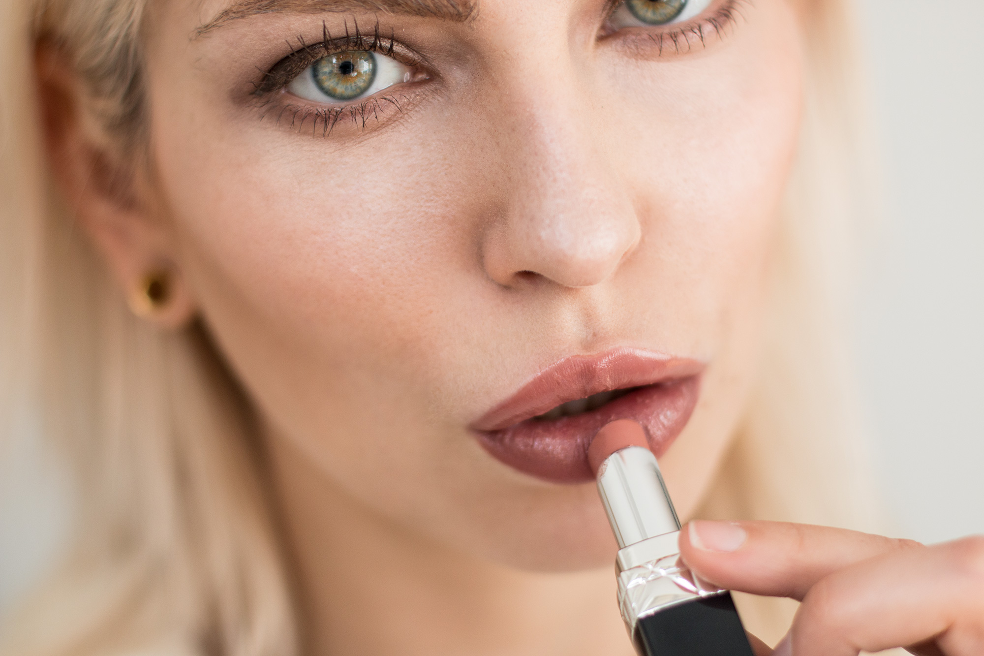 Direkt nach der Grundierung und vor dem Augenmake-up trage ich dünn einen Lipbalm auf (Benefit, Benebalm) und lass ihn so lange einwirken, wie ich meine Augen schminke. Nachdem ich das gesamte Make-up fertig geschminkt habe kommt zuletzt der Lippenstift in einem zart-glänzenden, etwas dunkleren Nude-ton (Dior, 628).   daily-make-up-3