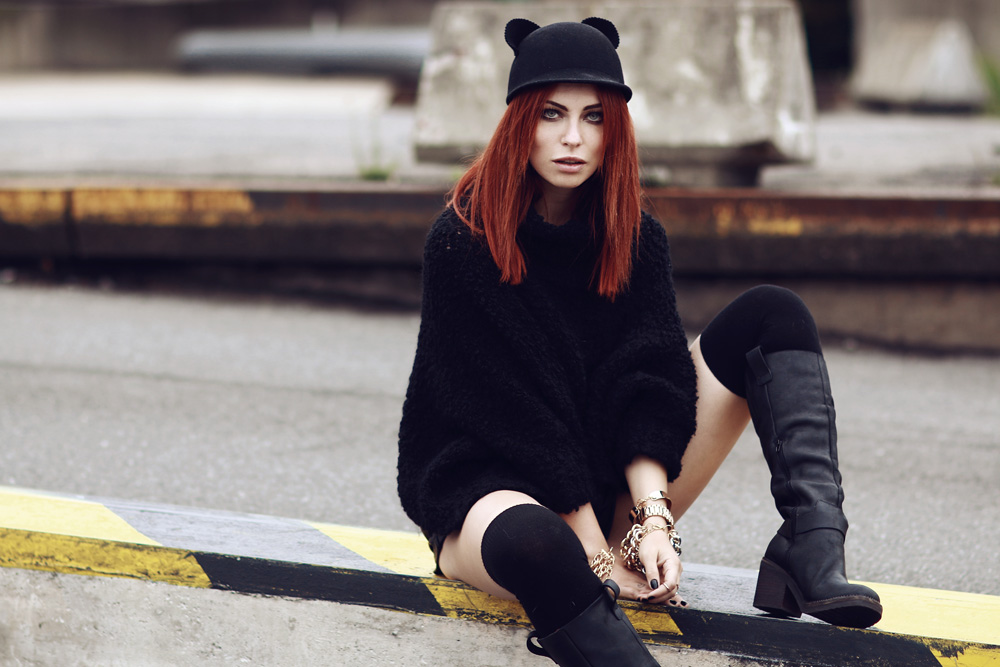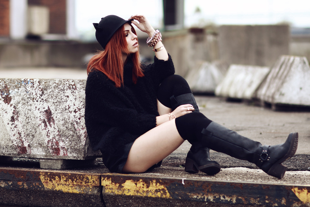 Auch beim heutigen Outfit ist die Hauptfarbe – Überraschung! – schwarz. Während das Montagsoutfit aber eher düster und edgy war, ist es heute dank der Katzenmütze ein bisschen süßer und verspielter. Dabei ist eigentlich alles wie immer: grober Strick, Leder und derbe Boots. Meine Lieblingskombi also, die finde ich, ein bisschen wie die erwachsene (oder auch nicht) Version meiner früheren Outfits aussieht. Überhaupt freue ich mich wieder total diese lustigen Mützen mit Öhrchen wieder zu tragen – ich besitze nämlich ein paar ultra kitschige Modelle die dringend wieder ausgeführt werden wollen^^ Surprise, surprise – another #allblackeverything outfit. But while last monday’s outfit was edgy and boyish, this one is more sexy and cute. It’s like always: comfy knitwear, leather and heavy boots. This favorite combination reminds me my old looks – do you remember them?