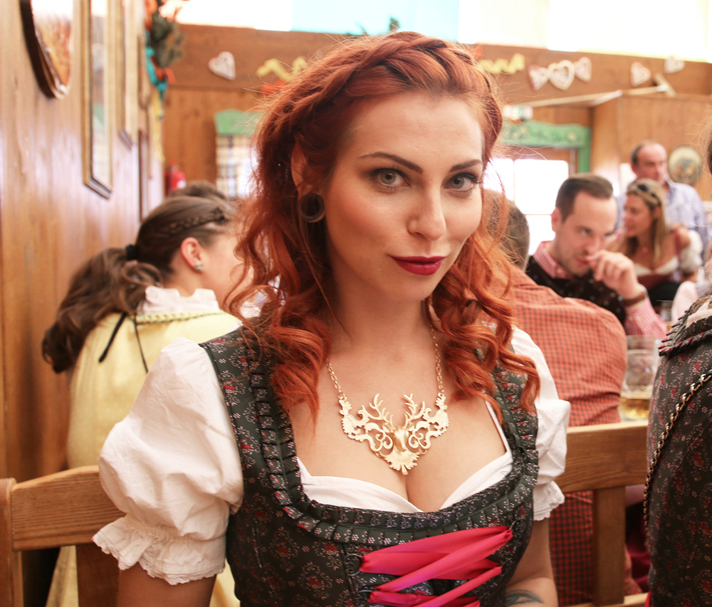 • Bei Dirndl muss ich immer an Dirne denken und angesichts des Auschnitts sind die zwei Begriffe gar nicht so weit voneinander entfernt. Einmal im Jahr finde ich es ja ganz witzig die Brüste hochzupushen und zu zeigen was man hat – oder besser: was man sich zurechtgemogelt hat. Denn bevor es losging und wir uns noch fertigmachten fand ich mich irgendwie ordinär, Vor Ort habe ich dann gemerkt, dass ich teilweise schüchtern aussah im Vergleich zu den anderen Okterfest-Besuchern!