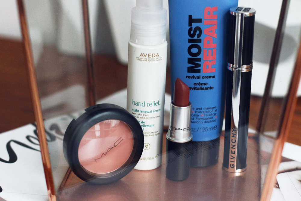 mac lipstick – retro mac rouge – melba matte givenchy mascara – noir couture kms moist repair – revival cream aveda hand relief night renewal serum