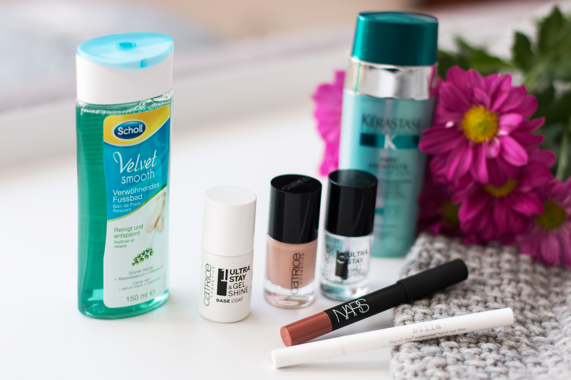 1. Catrice Ultra Shine Gel & Style Ich bin ja der Oberfan von diesen neuen, superhaltbaren Nagellack-Systemen in der Hoffnung, dass es irgendwann einen Nagellack geben wird, der bei mir mehr als 5 Tage hält. Im Frühling hatte ich mir so ein ähnliches Gel-Nagellack System von Sally geholt, war aber noch nicht so überzeugt von der Farbpalette – aber hey, es war mal wieder was Neues. Blöderweise war das aber auch alles andere als ein günstiges Vergnügen.. Mittlerweile ist der Trend auch (endlich!) in Deutschland angekommen und wurde gleich von Catrice übernommen. Es ist zwar ein wenig aufwändig alle Schichten aufzutragen, aber dafür hat man eine tolle Farbpalette, es ist vergleichsweise günstig und der Nagellack hält für mein Verhältnisse ewig! favoriten-oktober-3     2. Scholl – Velvet Smooth Fußbad Apropos Nägel.. Jetzt wo es wieder grau und nass ist da draussen und die Sonne schon um 18 Uhr untergeht gibt es nichts über ein herrliches Fussbad. Vor allem dann, wenn ich grade durchgefroren nach Hause gekommen ist und einfach nur noch will, dass mir endlich wieder warm wird (vorzugsweise nach Shootings!). Genau das sind die Momente, in denen ich Fußbäder liebe – insbesondere dann, wenn sich auch weiche Füßchen machen. favoriten-oktober-4     3. Kerastase – Fibre Architecte Ähnliche Verpackung, aber komplett anderes Körperende: Das Fibre Architecte ist ein Pflege-Serum für die Haare, von dem ich schon viel Gutes gehört habe. Doch jetzt, nachdem ich es selbst ausprobiere und nach dem Haarewaschen immer reinknete kann ich es nur bestätigen: es ist wirklich klasse, versiegelt die Spitzen und funktioniert perfekt für geschädigte Haare, wie ich sie nach den Millionen Blondierwäschen habe. Außerdem hat es einen eingebauten Hitzeschutz, der sowieso nie schaden kann :)     4. Stila – stay all day liquid eye liner (white) Zur Zeit fahre ich total auf diesen cleanen Eisprinzessinnen Looks ab und dazu darf einer meiner Lieblingslooks nicht fehlen: die mit weißem Kajal betonten Augen. Einen weißen, gut pigmentierten (flüssigen) Kajal zu finden ist allerdings gar nicht so eine einfache Aufgabe, aber ich bin dennoch fündig geworden bei Stila. Der hat nicht nur ein kräftiges Weiss, sondern hält auch noch richtig gut. Ein richtiges all time favorites Produkt, das ich mir vermutlich nicht zum letzten Mal gekauft habe. favoriten-oktober-2     5. Nars – Velvet Matte Lip Pencil (Walkyrie) Ich konnte mich kaum entscheiden, welchen Lippenstift ich euch vorstellen soll, habe mich dann aber für den matten Lip Pencil entschieden, der in einem natürlichen, dunklen und holzigen Rot-Rose Ton daherkommt. Nein, ernsthaft, diese Farbe ist kaum konkret zu beschreiben, weil sie sich irgendwo dazwischen aufhält, aber dabei recht natürlich aussieht, wodurch sie auch einfach ideal zu jeder Gelegenheit sowohl tagsüber, als auch abends passt. Außerdem hält der Pencil superlange, kann sowohl leicht, als auch etwas dicker aufgetragen werden und sieht auch noch dann gut aus, wenn er ein wenig verblasst ist! Ein echter Allrounder!! favoriten-oktober-1 I haven’t show you my beauty favorites for quite a while now, although I’ve been shopping so much beauty stuff this month. Especially new lipsticks – I’m obsessed by new lipsticks, so maybe I’ll show you my new babies next week.   But for now these are my 5 favorites this month: