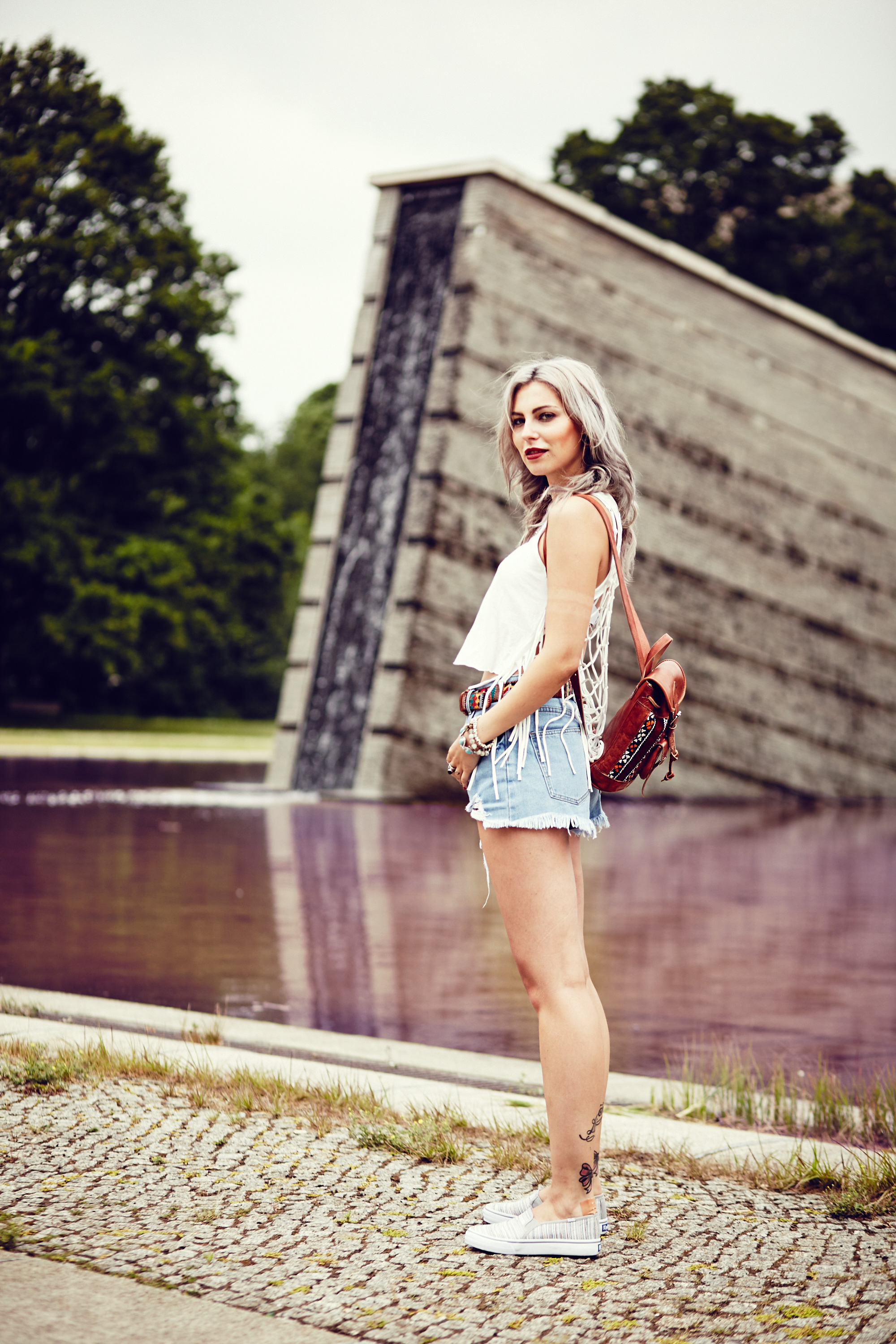 Wer sagt eigentlich, dass man weit weg fahren muss für das perfekte Festivalfeeling? Grade wenn man in Berlin oder Hamburg wohnt, sind die guten Konzerte quasi um die Ecke, so wie diesen Sonntag bei der Fete de la musique (wo übrigens auch Pool auftreten!) mitten in der Stadt – um nur eins der zahlreichen Festivals in Berlin zu nennen! Passend dazu werde ich mich in meine tanzbare Festival-Uniform werfen passend zum Berliner Sommerwetter, wenn es mal wieder richtig warm und schwül werden kann. Da ist so ein luftig leichtes Outfit vor allem in Kombination mit bequemen Slippern und einem Rucksack fürs Nötigste eben genau das Richtige für einen perfekten Festivaltag! Who says that you have to go far away for the perfect festival feeling? Especially in Berlin or Hamburg the good concerts are just around the corner, like this Sunday at the Fête de la Musique in the city center! But for the perfect festival feeling you need the perfect festival outfit, one, that that you can wear on a hot summer day in Berlin. I’ve chosen a crop top with distressed shorts in combination with slippers and a little backpack. Sometimes finding the perfect festival outfit can be so easy.