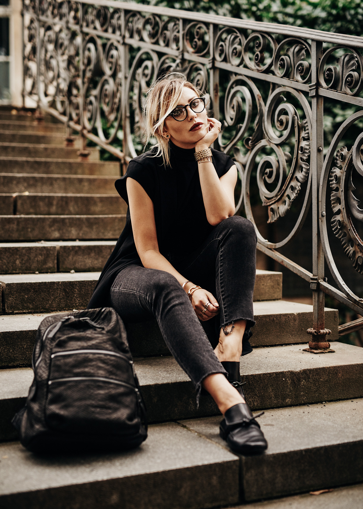 So, yeah, today’s look is a bit more high-necked than my typical outfits, but what can I say, it’s a combination of a bunch of favorite pieces, no less. I’m wearing my favorite jeans (we all have a favorite pair of jeans, don’t we?), an unusually tight top with small turtleneck, comfy mules (did I mention that mules are my favorite trend of the season?) and – the highlight – a huge rucksack by Liebeskind. I love how much room there is in this backpack, and I wouldn’t want to miss it – it’s become a trusted travel companion in no time whatsoever. And what’s more, it’s made of super soft leather. Gotta point that out, it feels amazing to the touch.   Let’s face it, talking about timeless items, what fits the description more than a trusted, black quality rucksack to pack all my favorite items in?