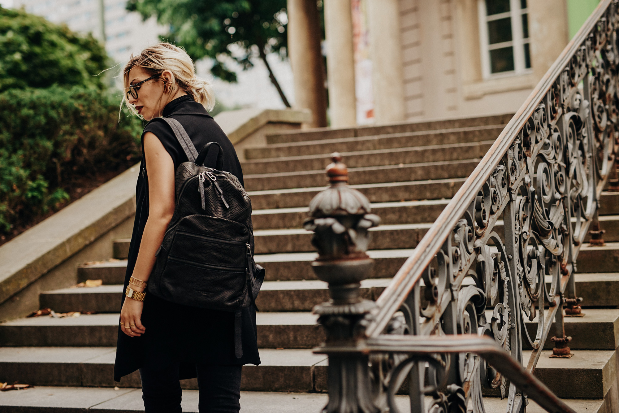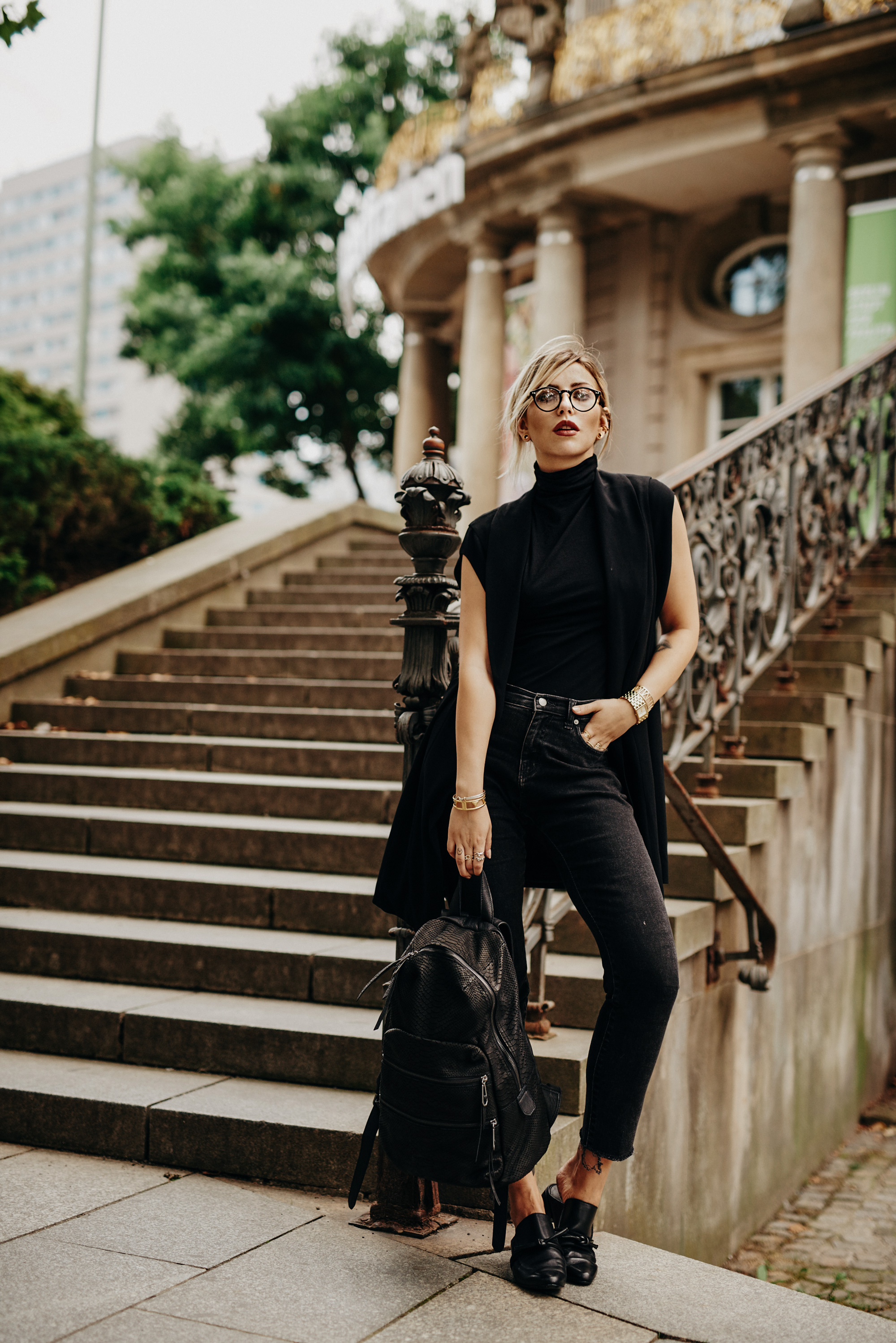 So, yeah, today’s look is a bit more high-necked than my typical outfits, but what can I say, it’s a combination of a bunch of favorite pieces, no less. I’m wearing my favorite jeans (we all have a favorite pair of jeans, don’t we?), an unusually tight top with small turtleneck, comfy mules (did I mention that mules are my favorite trend of the season?) and – the highlight – a huge rucksack by Liebeskind. I love how much room there is in this backpack, and I wouldn’t want to miss it – it’s become a trusted travel companion in no time whatsoever. And what’s more, it’s made of super soft leather. Gotta point that out, it feels amazing to the touch.   Let’s face it, talking about timeless items, what fits the description more than a trusted, black quality rucksack to pack all my favorite items in?