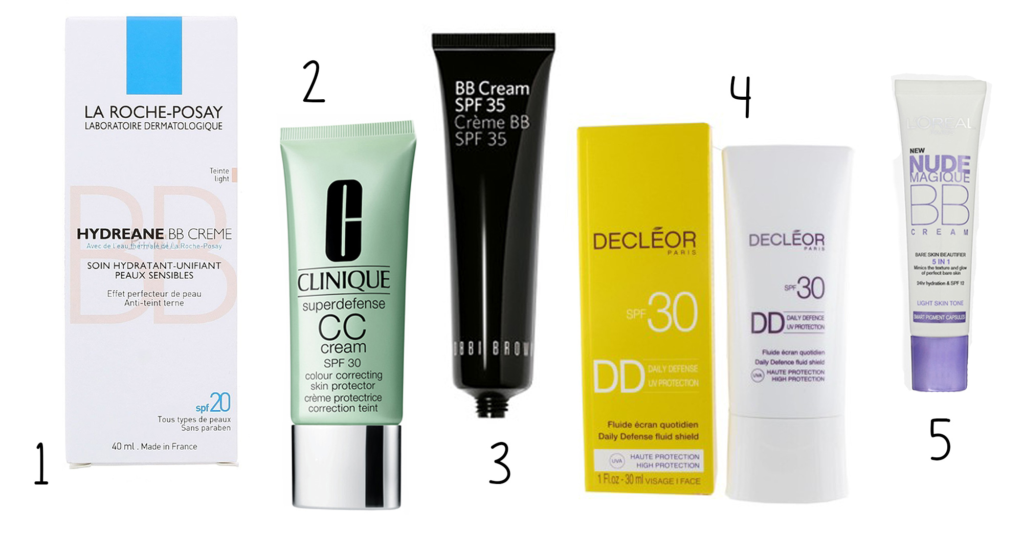 BB-CC-DD-Cream-3 Kiko Kiehl’s Nuxe   BB-CC-DD-Cream-5   1. La Roche Posay, BB Creme 2. Clinique, Superdefense CC Creme 3. Bobbi Brown, BB Creme 4. Decléor Paris, Daily Defense DD Creme 5. L´Oréal, Nude Magique CC Creme