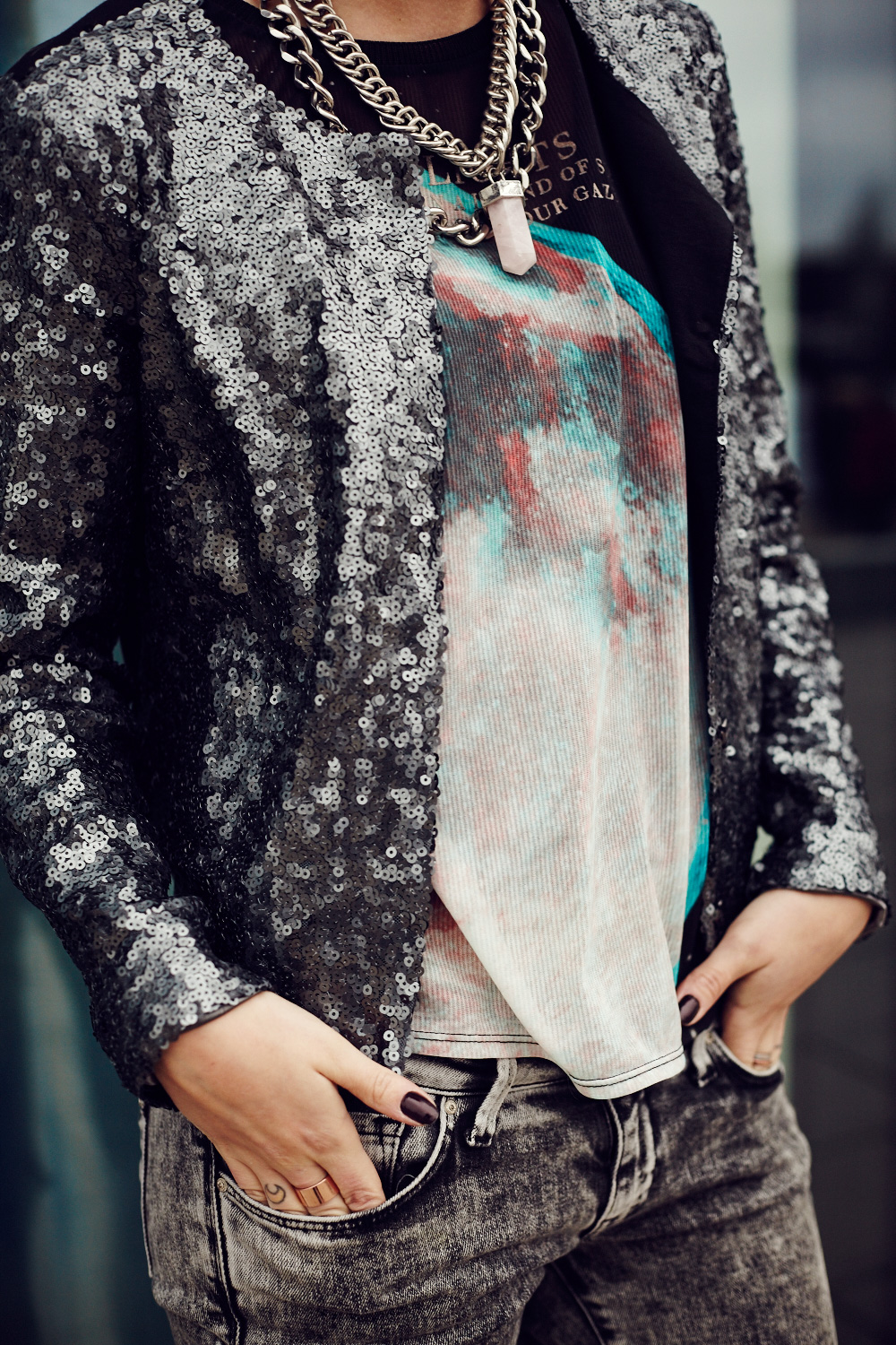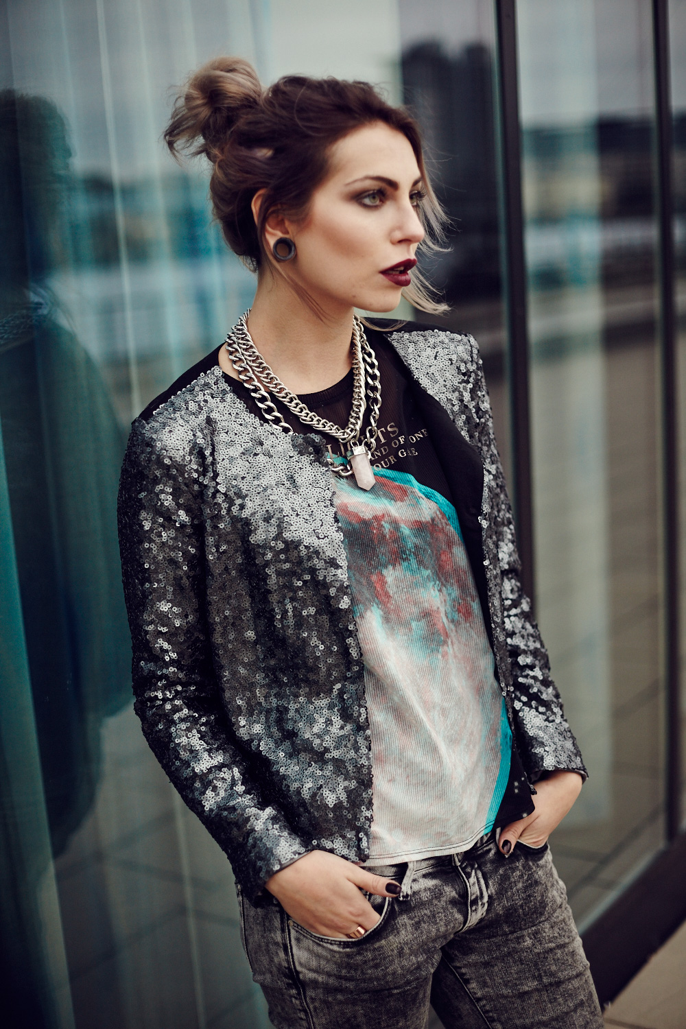 Passend zum Wochenende habe ich ein ziemlich festliches Glitzer Glitzer Outfit für euch. Mir ist vorhin mal aufgefallen, dass ich schon echt verhältnismäßig lange keine Pailletten-Outfits mehr getragen habe – dabei liebe ich diese kleinen glitzernden Dinger doch so! Wird auf jeden Fall mal wieder Zeit für mehr Paillettenoutfits, insbesondere weil Weihnachten und Silvester ja immer näher rücken und Pailletten an Silvester bei mir schon so eine Art Tradition haben. Allerdings will ich es auch mit den fancy Outfits nicht übertreiben, deswegen habe ich die Jacke mit acid washed Jeans und Dutt wieder ‘downgedressed’ (immer diese Deutsch-Englisch-Hybride) – schließlich will ich ja nicht aussehen wie ein Tannenbaum :) Just in time for the weekend I have a festive glam & glitter outfit for you. I’ve noticed that I haven’t shown you sequined outfits for a while now, so I need to change this! I love sequins, especially on Christmas and New Year’s Eve and wearing sequins on New Year’s Eve became for me kind of tradition. Anyway, this outfit shouln’t look too fancy so I downdressed it with a distressed jeans and a bun – at least I don’t want to look like a Christmas tree :)