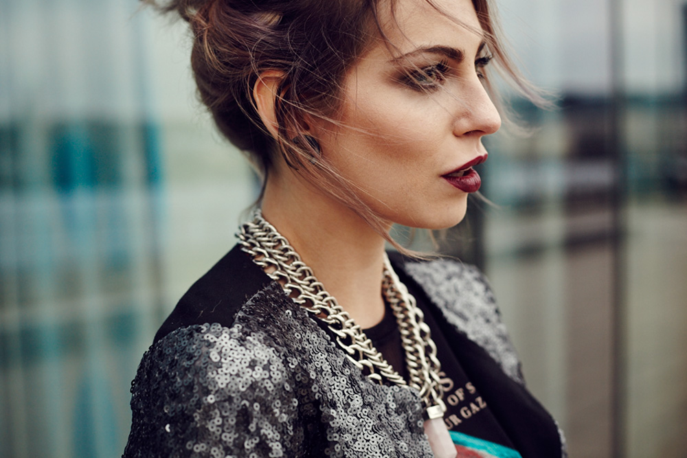 Passend zum Wochenende habe ich ein ziemlich festliches Glitzer Glitzer Outfit für euch. Mir ist vorhin mal aufgefallen, dass ich schon echt verhältnismäßig lange keine Pailletten-Outfits mehr getragen habe – dabei liebe ich diese kleinen glitzernden Dinger doch so! Wird auf jeden Fall mal wieder Zeit für mehr Paillettenoutfits, insbesondere weil Weihnachten und Silvester ja immer näher rücken und Pailletten an Silvester bei mir schon so eine Art Tradition haben. Allerdings will ich es auch mit den fancy Outfits nicht übertreiben, deswegen habe ich die Jacke mit acid washed Jeans und Dutt wieder ‘downgedressed’ (immer diese Deutsch-Englisch-Hybride) – schließlich will ich ja nicht aussehen wie ein Tannenbaum :) Just in time for the weekend I have a festive glam & glitter outfit for you. I’ve noticed that I haven’t shown you sequined outfits for a while now, so I need to change this! I love sequins, especially on Christmas and New Year’s Eve and wearing sequins on New Year’s Eve became for me kind of tradition. Anyway, this outfit shouln’t look too fancy so I downdressed it with a distressed jeans and a bun – at least I don’t want to look like a Christmas tree :)