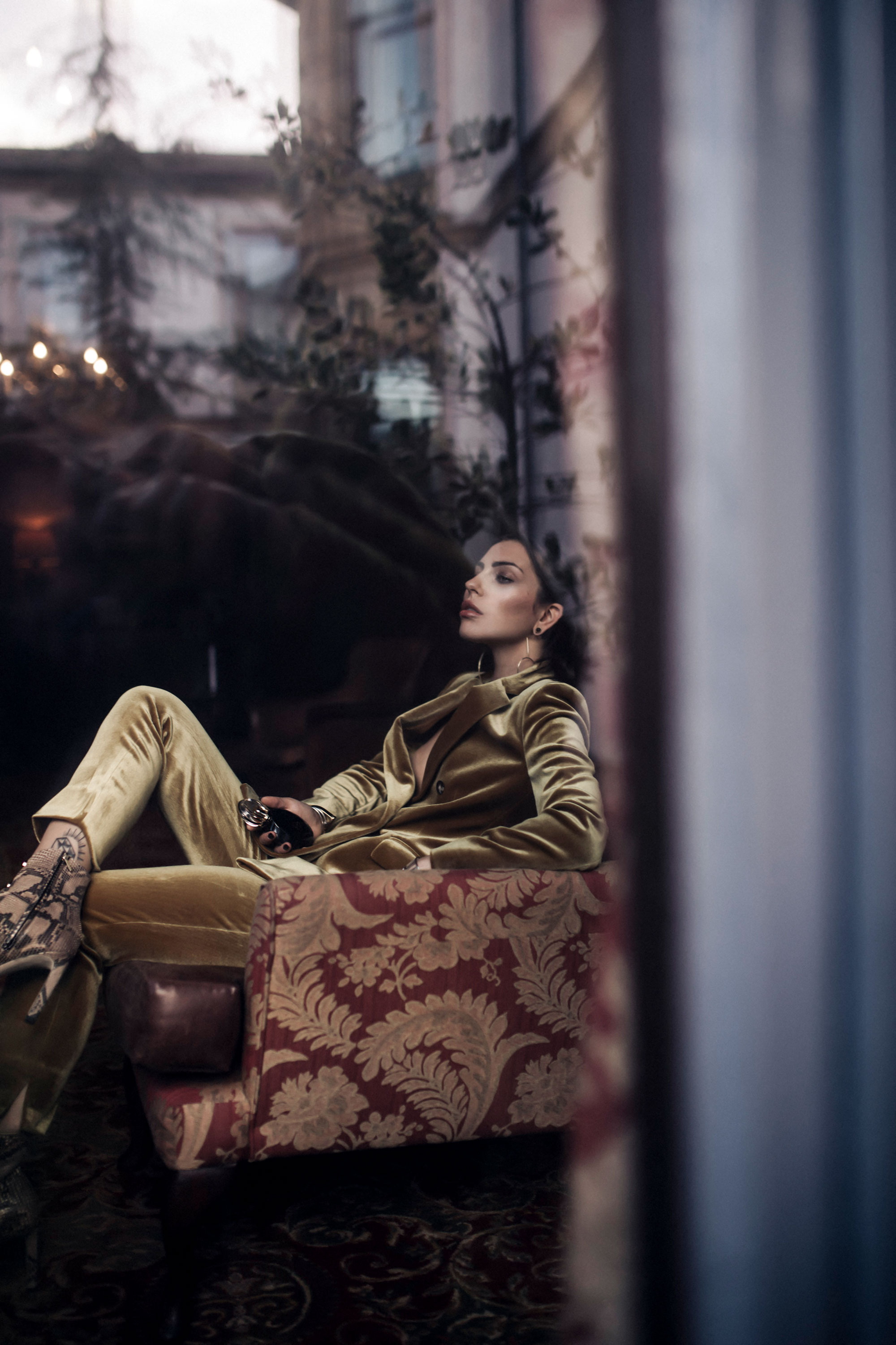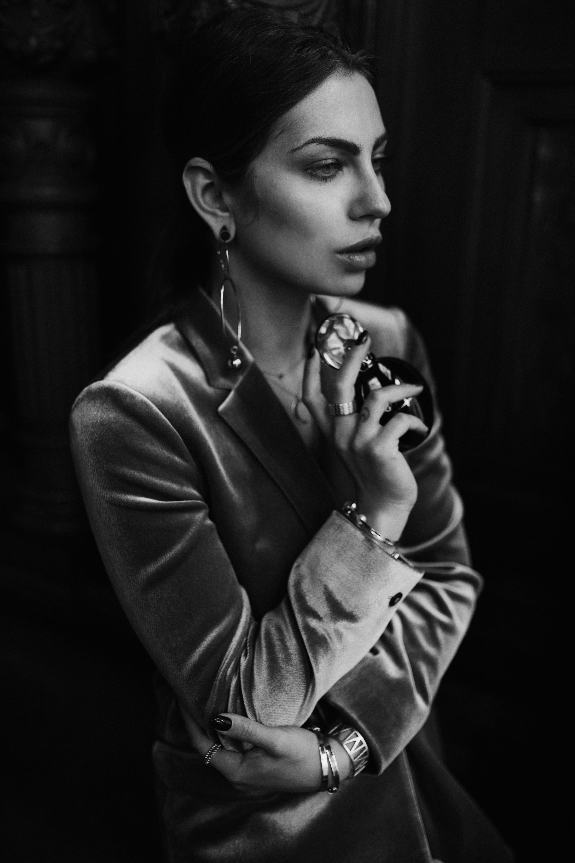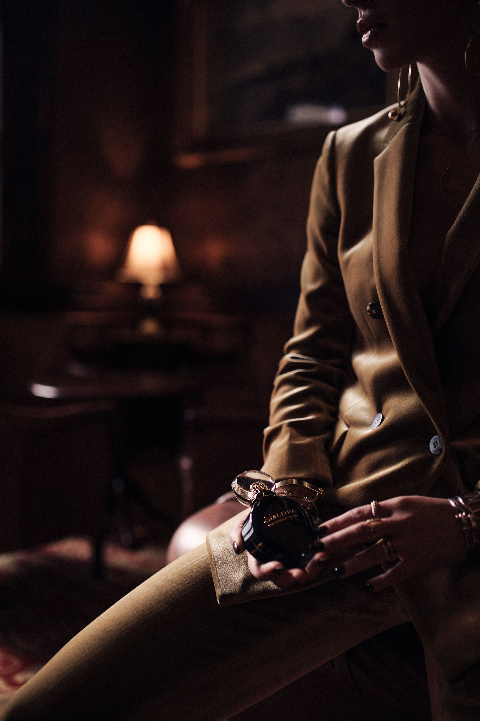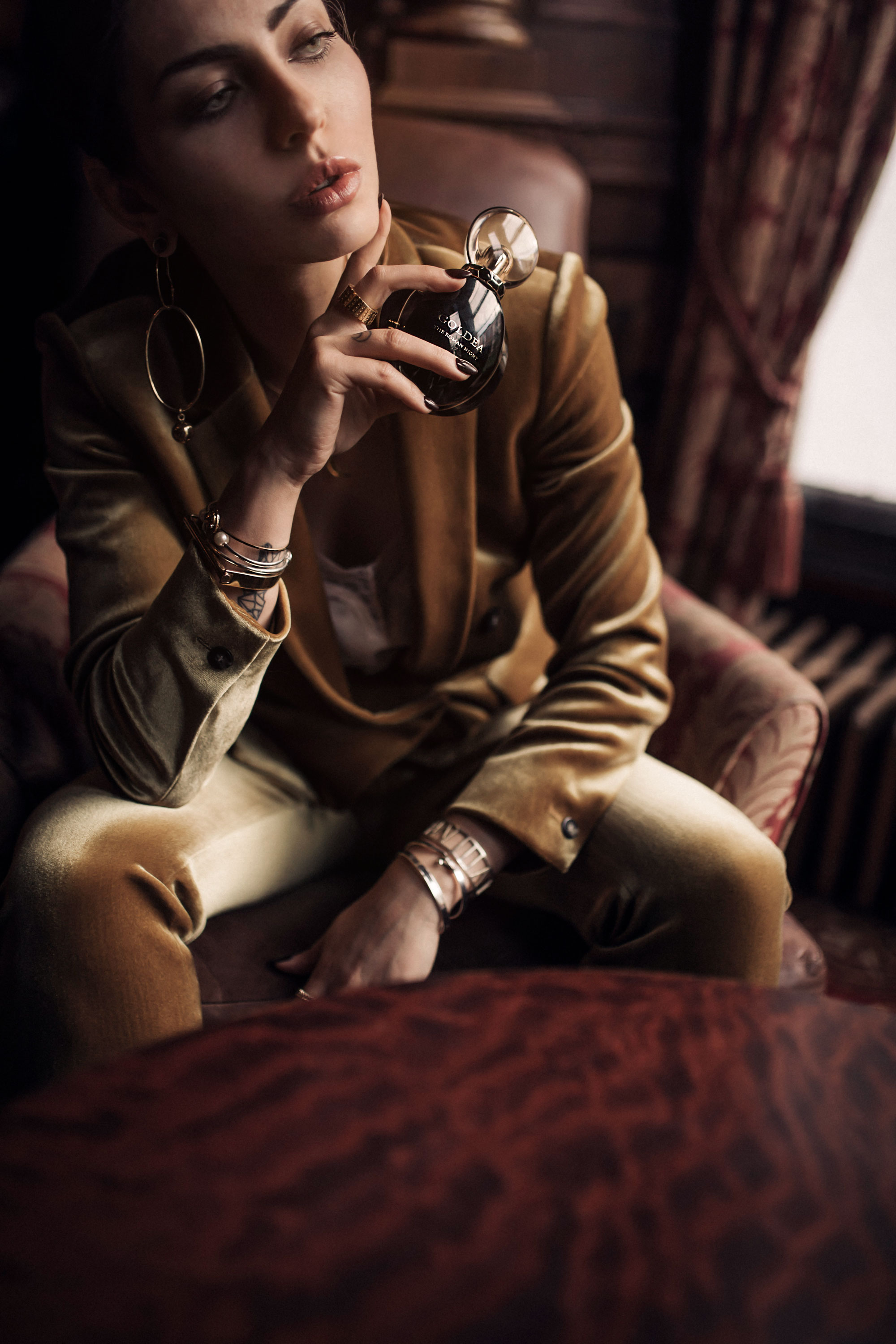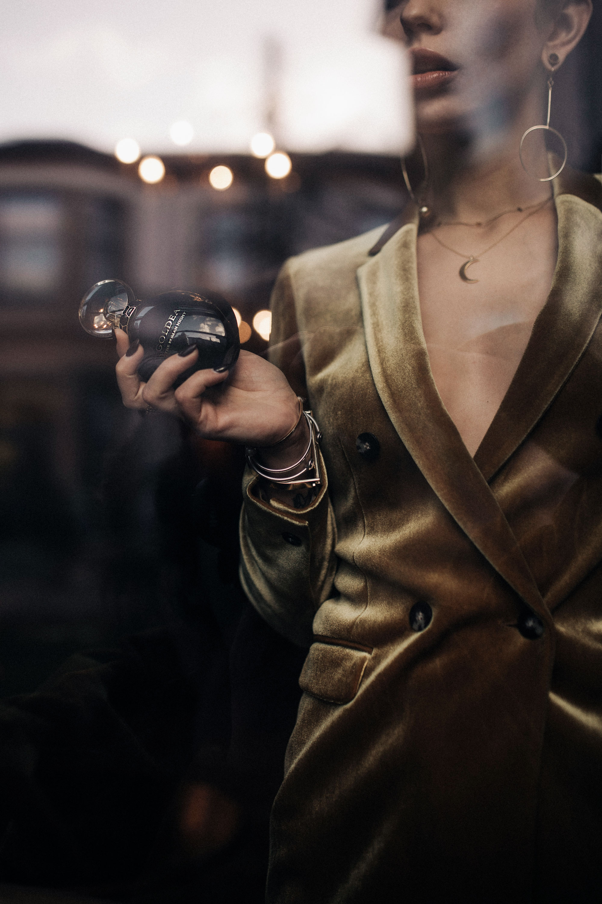Der Flakon ist sehr schön gestaltet, glatt, aber mit Struktur, edel glänzend mit Gold und nachtblau (oder schwarz). Du hast diese Elemente wieder in deinem Outfit aufgegriffen: goldener Samt – ein Stoff mit Glanz, aber gegen den Strich betrachtet, hat er Struktur. Parfum und Körper verpackt in eine Hülle aus klaren, fast strengen Linien (Blazer, die Kanten am Flakon), durch weiche Linien feminin und anziehend (Seidentop, runde Form). Immer wieder fasziniert mich dein feines Gespür, Farben und besonders Formen wieder aufzunehmen und wie ein Echo wiederzugeben: der runde Verschluss, die großen, runden Elemente der Ohrringe, die runden Armreifen, und ganz besonders der flache, goldene Reif, der die seitliche Kante des Glasbehälters aus der Ferne fast umschließen könnte, so sehr ähneln sich die Krümmung und Breite. Hättest du unter deinem goldenen Armreif mit römischen Zahlen noch ein schwarzes Band getragen, wäre es wie die “Krone” des Flakons, die sich an dein Handgelenk schmiegt. Faszinierend!