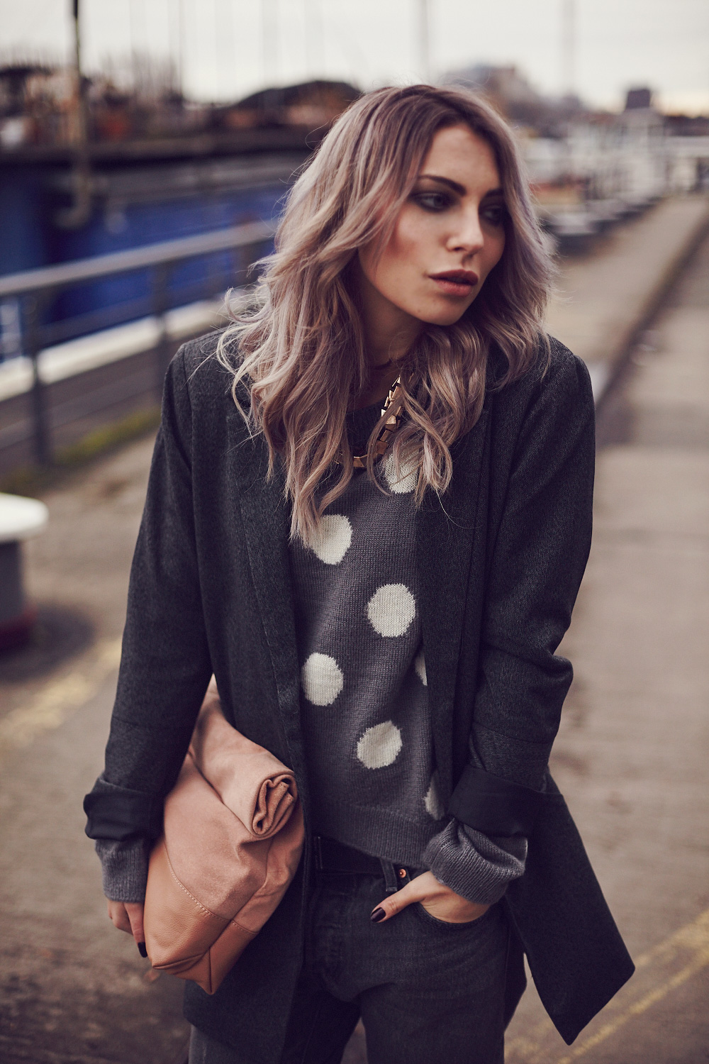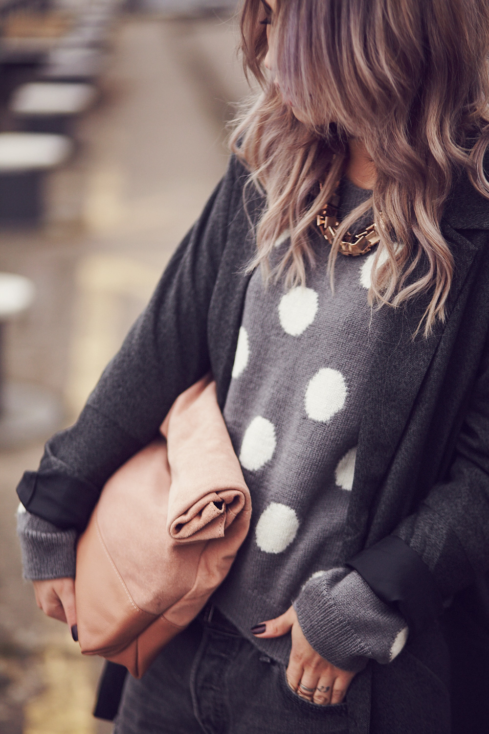 Seit ich die gräulichen Haare habe, mausert sich Grau immer mehr zu meiner Lieblingsfarbe, quasi fast noch vor Schwarz – aber nur fast! Trotzdem ist der Außenseiter Grau grade jedenfalls ganz vorn dabei, was meine aktuellen Lieblingsteile und deren Farbe betrifft, denn Grau hat halt den Vorteil, dass es die Nicht-Farbe (für mich ist es aber ganz klar eine Farbe!) auch in unterschiedlichen Tönen und Schattierungen gibt: hellgrau, mittelgrau, dunkelgrau… dann noch grau, das eher ins bläuliche geht und grau, das eher ins Nude geht. Grautöne eben. Und so passiert es in letzter Zeit immer öfter, dass ich Grau mit Grau mixe, unterschiedliche Töne und Muster, die dennoch miteinander harmonieren. Um das Ganze noch spannender zu gestalten, mixe ich zusätzlich weibliche Elemente wie die Ankle Boots und den Punkte-Pullover mit maskulinen Elementen, wie der Boyfriend Jeans und dem oversized Blazer. Um den Look abzurunden, kombiniere ich dazu eine nude Clutch, die an eine Lunchtüte erinnert und eine Statementkette in Kupfergold. Ich will’s ja nicht zu bunt treiben :D   Since my hair has a grayish color, gray become my favorite color. Anyway most of my favorite pieces are gray, because gray has the advantage, that the non-color is also available in different colors and shades: Light gray, medium gray dark gray … then gray, that is more bluish and gray that is more nude. It’s never just gray. And so it happens more and more often lately that I’m mixing gray with gray, different tones and patterns that harmonize all together. In this outfit I combine not only gray colors, but additionally I mix feminine elements such as the ankle boots and the sweater with masculine elements,such as the boyfriend jeans and oversized blazer. To complete the look, I wear a nude clutch that looks like a lunch bag and a statement necklace in copper gold.