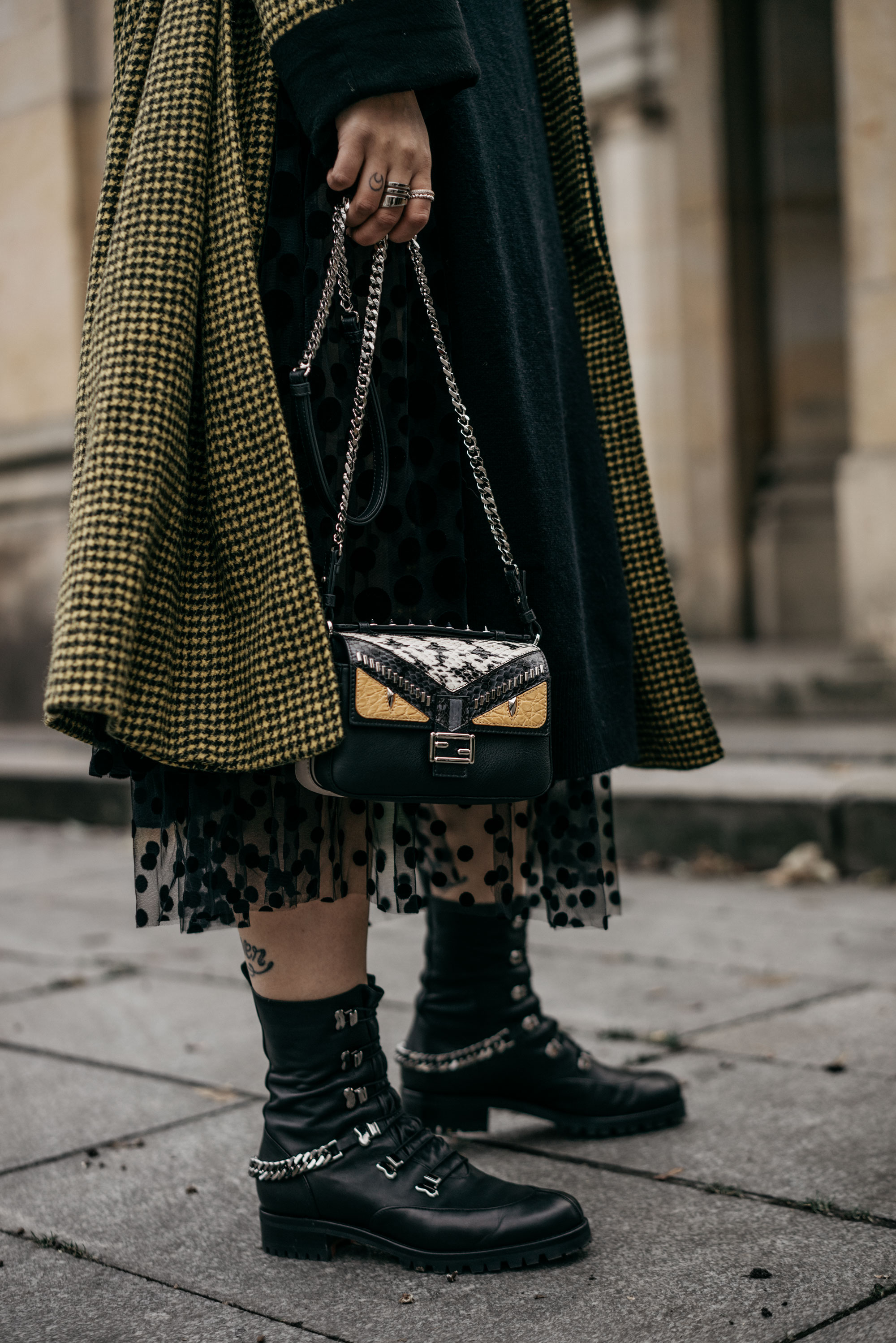 How to: Berlin street style | fashion & outfit | wearing: flat Christian Louboutin boots, dots dress, Haider Ackermann coat, small Fendi double Baguette bag 3