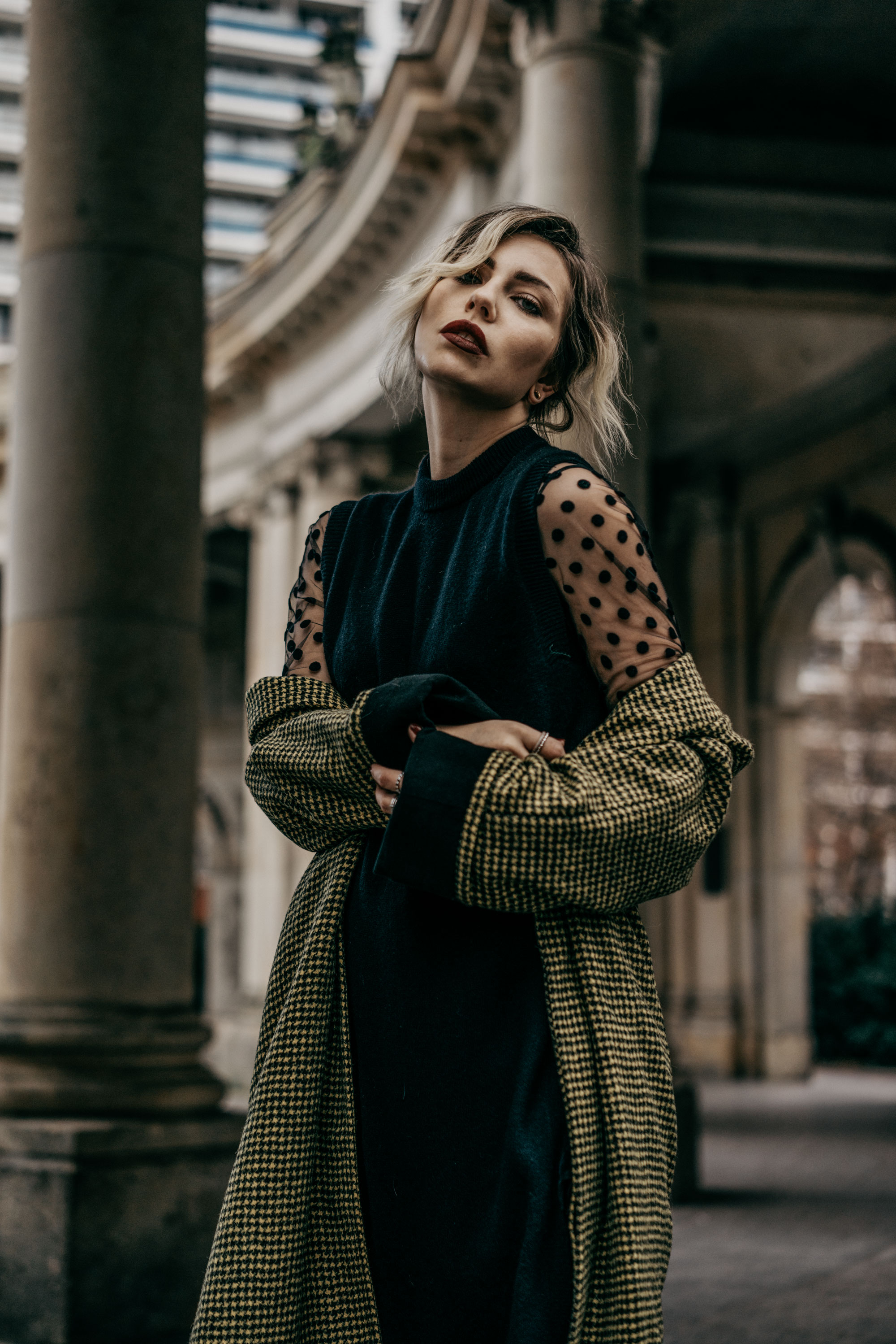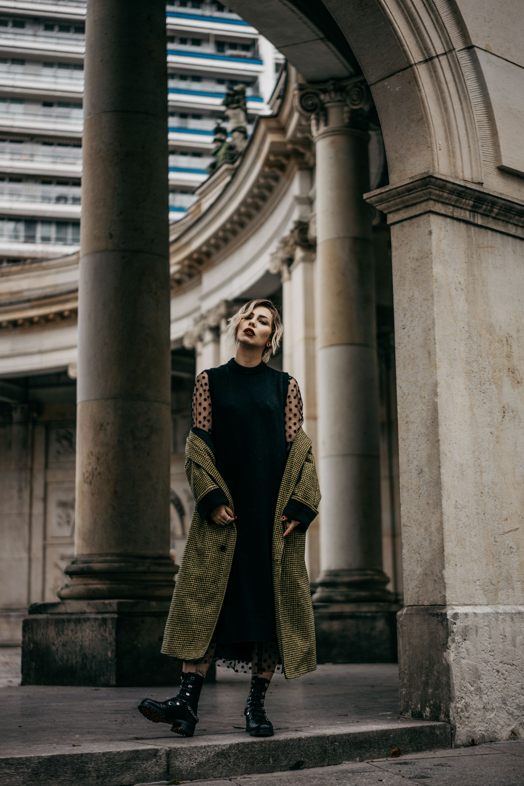 About my outfit:   For today’s outfit I picked an oversized dress, which does not accentuate my figure at all, but at the same time it’s a real eye-catcher, being transparent as it is. I combine it with a long knitted dress (it’s cold here right now), an oversized coat with my favorite pattern (I love herringbone), really cool, rough boots and a statement bag. I’m especially in love with the boots, they’re all I’ve been wearing the past couple of days. They’re so Berlin, just right for this city. You’ll see me wearing them in a couple more outfits in the near future.   My characteristic Berlin outfit is matched by the location for this shoot: a perfect contrast between old and new, a tension that is very pronounced here. This little park with its circular path is surrounded by slab high rises that make it seem almost out of place. Well, this mix, this particular contrast between tradition and a sense of futurism is another part of the essence that defines Berlin.