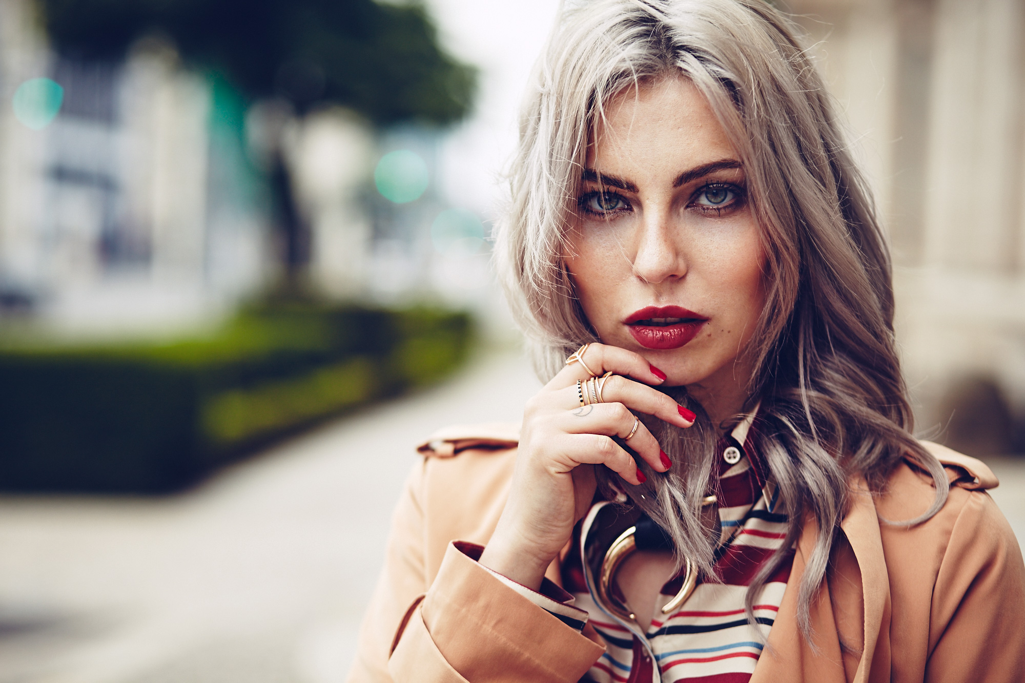 Nach der Fashion Week brauche ich grade noch ein kurzes Weilchen, um mich zu erholen, bevor es wieder Vollgas weitergeht. Deswegen ist mein Outfit heute auch nicht allzu experimentell, sondern gespickt mit den üblichen Verdächtigen wie der Ledershorts, der roten Tasche oder meinem Trenchcoat. Hinzugekommen ist diese Bluse in die ich ganz verliebt bin (rote Streifen!) und die ich im Sale geschossen habe. Weniger entspannt sind dagegen die Schuhe. Ich liebe Römersandalen ja zur Zeit wirklich sehr, aber diese Schnüre sind echt ein Gräuel. Entweder sie schnüren ab oder sie fallen runter. Ich glaube man muss Römersandalen-geeignete Waden haben, damit die Nummer funktioniert, aber die scheine ich nicht zu haben, weswegen ich die Schuhe nur fürs Foto hochgeschnürt habe. Aber abgesehen davon ist es ein super entspanntes Outfit für den Sommeralltag :) After the Fashion Week I need a while to relax and so my outfit today is more comfy, too.