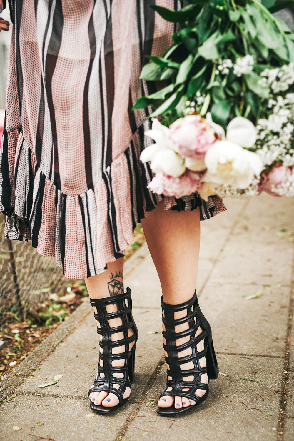 Have you ever picked your outfit to match your favorite flower? No? SO FAR, Neither have I.   Today everything is dedicated to my favorite flower – the peony. The delicate colors, the beautiful form, but especially the enchanting smell emanating from this flower, are all the reasons that the peony is my favorite flower. Hardly a flower symbolizes the coming of spring so intensely as this flower. Many good reasons just to let inspiration take over when choosing an outfit. That’s why I chose to wear a soft dress with ruffles in combination with edgy elements such as leather jacket or shoes. Because, the peony is not only sweet, but also sexy has a very sexy scent.