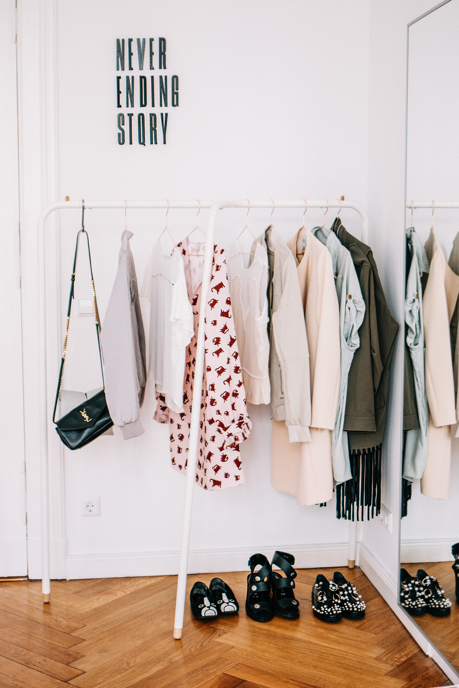 A highlight – quite literally – is my logo in pink neon tubes by Sygns. You don’t see at first sight what’s going on, but when I switch it on my logo pops out miraculously. A real eye-catcher.   All the other items in this room were selected with great care as well, like my clothes rail by Bolia (an alternative to the ubiquitous rail by Hay), the minimalist carafe by Georg Jensen, the somewhat shy table lamp, the individual pictures – each lovingly selected. Even the bunch of flowers is a special edition arranged by Jessie for Bloomy Days.   One thing I learned: this room needs time. It’s a space that grounds me. I need to have time to be in this room, and I need to make that time consciously. I need to fill this space with life, just like I filled my blog, and let it all grow. In other words, I guarantee that this won’t be the last update from this room. I’ll keep ya posted… :)