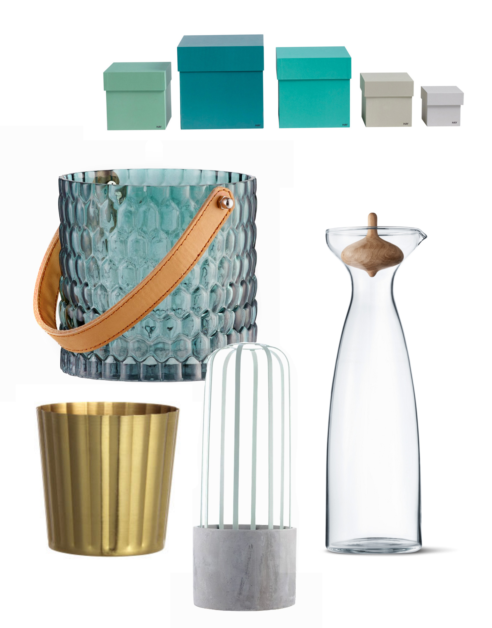 flowerpots: Bolia colorful boxes: Hay golden flowerpot: H&M carafe: Georg Jensen