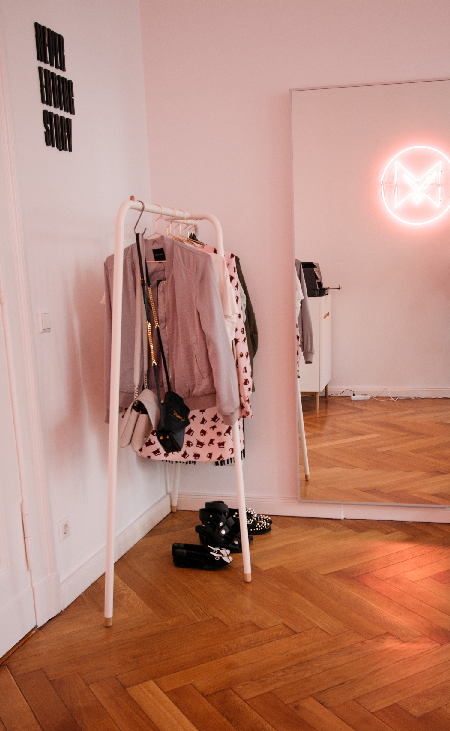 A highlight – quite literally – is my logo in pink neon tubes by Sygns. You don’t see at first sight what’s going on, but when I switch it on my logo pops out miraculously. A real eye-catcher.   All the other items in this room were selected with great care as well, like my clothes rail by Bolia (an alternative to the ubiquitous rail by Hay), the minimalist carafe by Georg Jensen, the somewhat shy table lamp, the individual pictures – each lovingly selected. Even the bunch of flowers is a special edition arranged by Jessie for Bloomy Days.   One thing I learned: this room needs time. It’s a space that grounds me. I need to have time to be in this room, and I need to make that time consciously. I need to fill this space with life, just like I filled my blog, and let it all grow. In other words, I guarantee that this won’t be the last update from this room. I’ll keep ya posted… :)