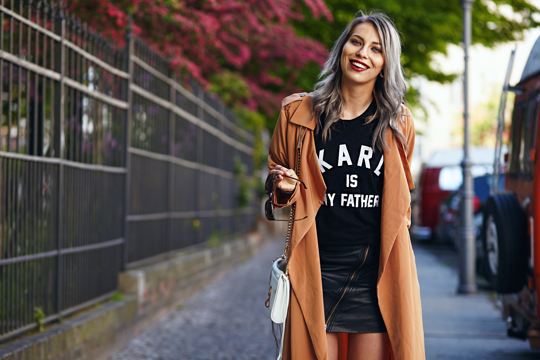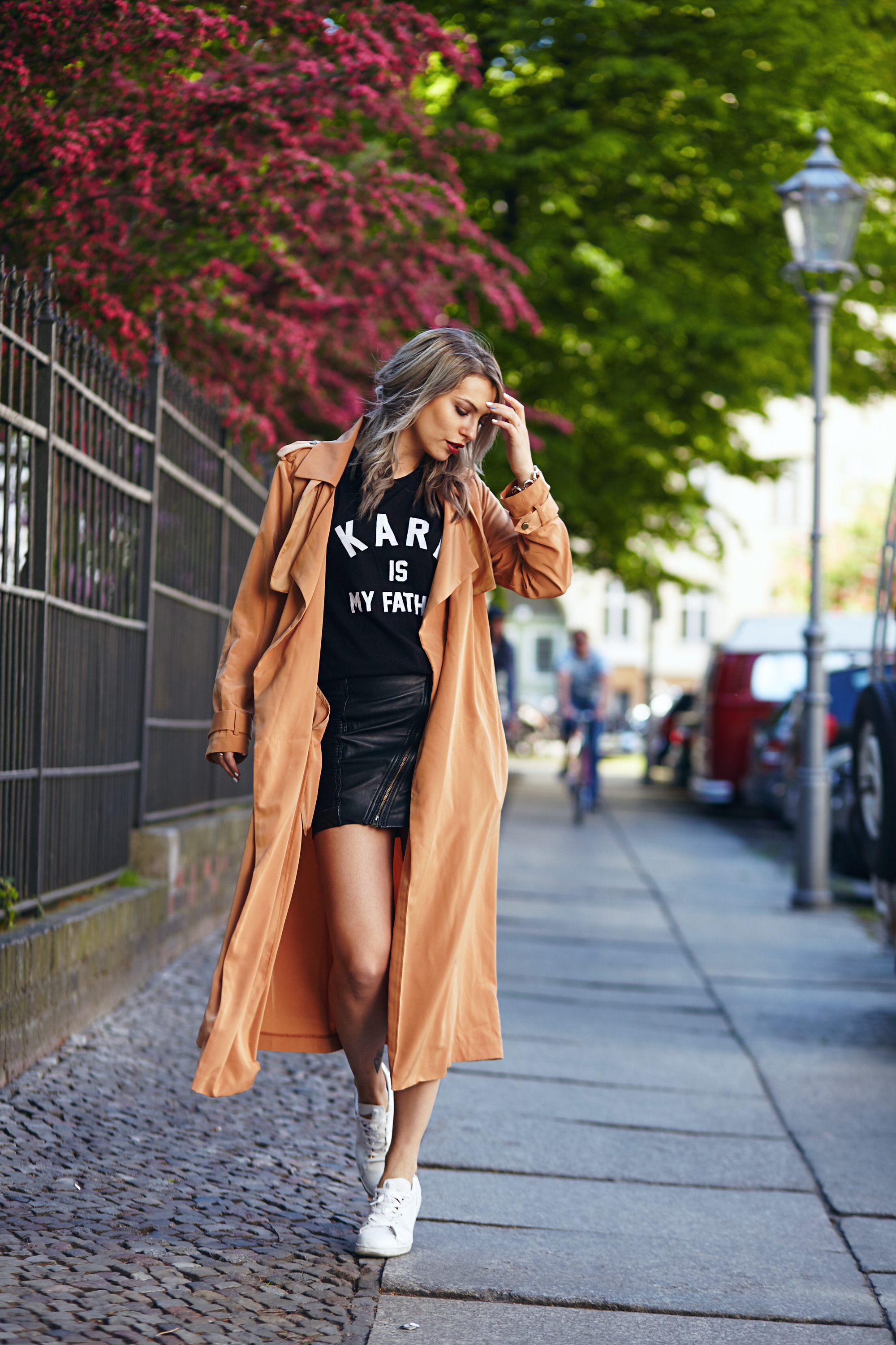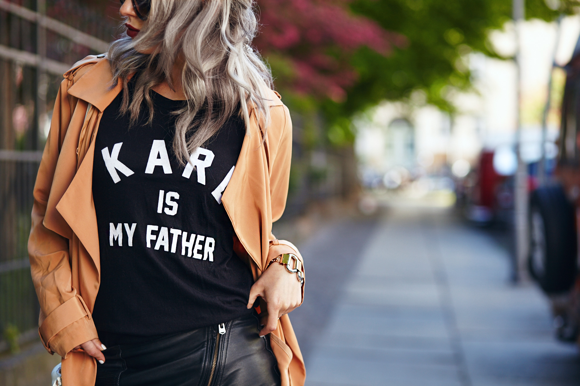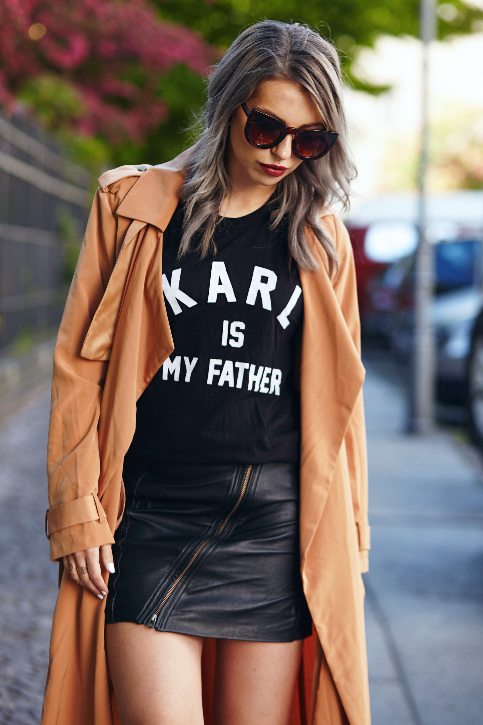 Karl is my father. Schön wär’s! Aber träumen darf man ja wohl noch und weil ich jedes Mal einen kurzen Herzstillstand bekomme, wenn ich Karl Lagerfeld sehe passte das Shirt auch einfach perfekt. Der Lederrock wertet das Shirt ein bisschen auf, während die Sneaker einen ganz coolen Kontrast bilden. Meinen Lieblings-Trenchcoat für das ich-kann-mich-nicht-entscheiden-Wetter obendrauf und fertig ist der Frühlingslook! Karl is my father. Too cool to be true. Every time I see Karl Lagerfeld my heart stops for a moment, so the tshirt is just perfect for me and my fangirl moments.