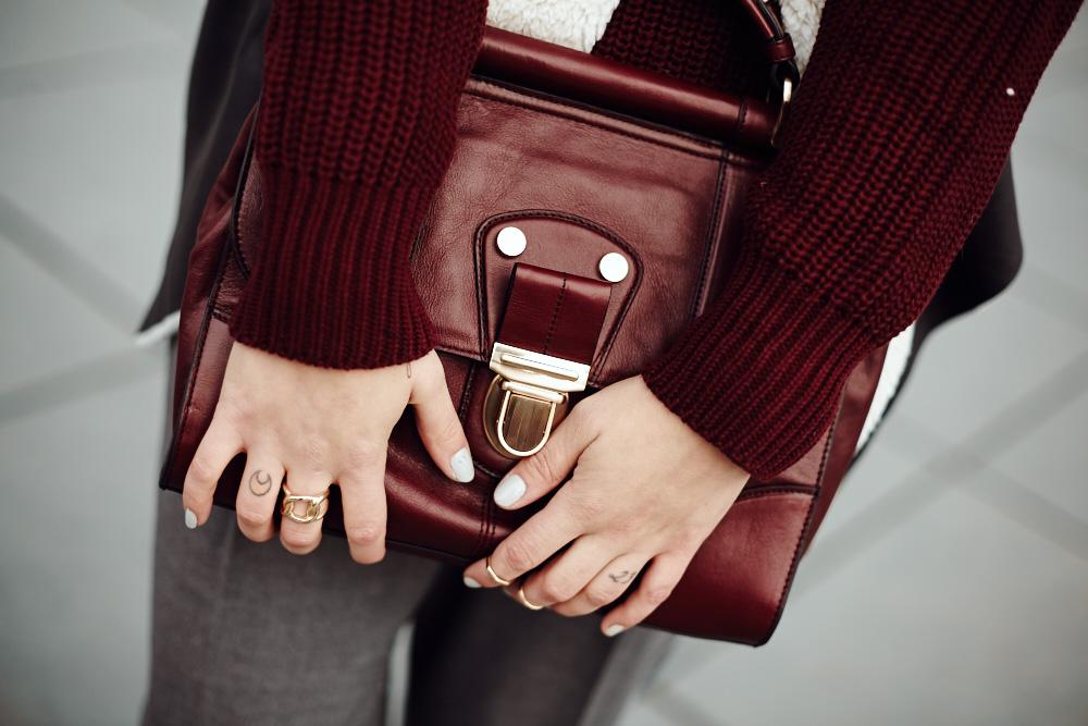 Ich mag diese “Würz” Farben. Auf Marsala freue ich mich vor allem beim Make up. Das Outfit steht dir Super und ich finde du hast die Sachen spannend kombiniert. Auch wenn der Pulli irgendwelche Jugend Assoziation in mir auslöst. Ich glaube ich hatte mal so ein Seemanns Pulli in dem Schnitt und Strick und ich habe ihn gehasst ;-) Die Tasche ist ein echter Traum!