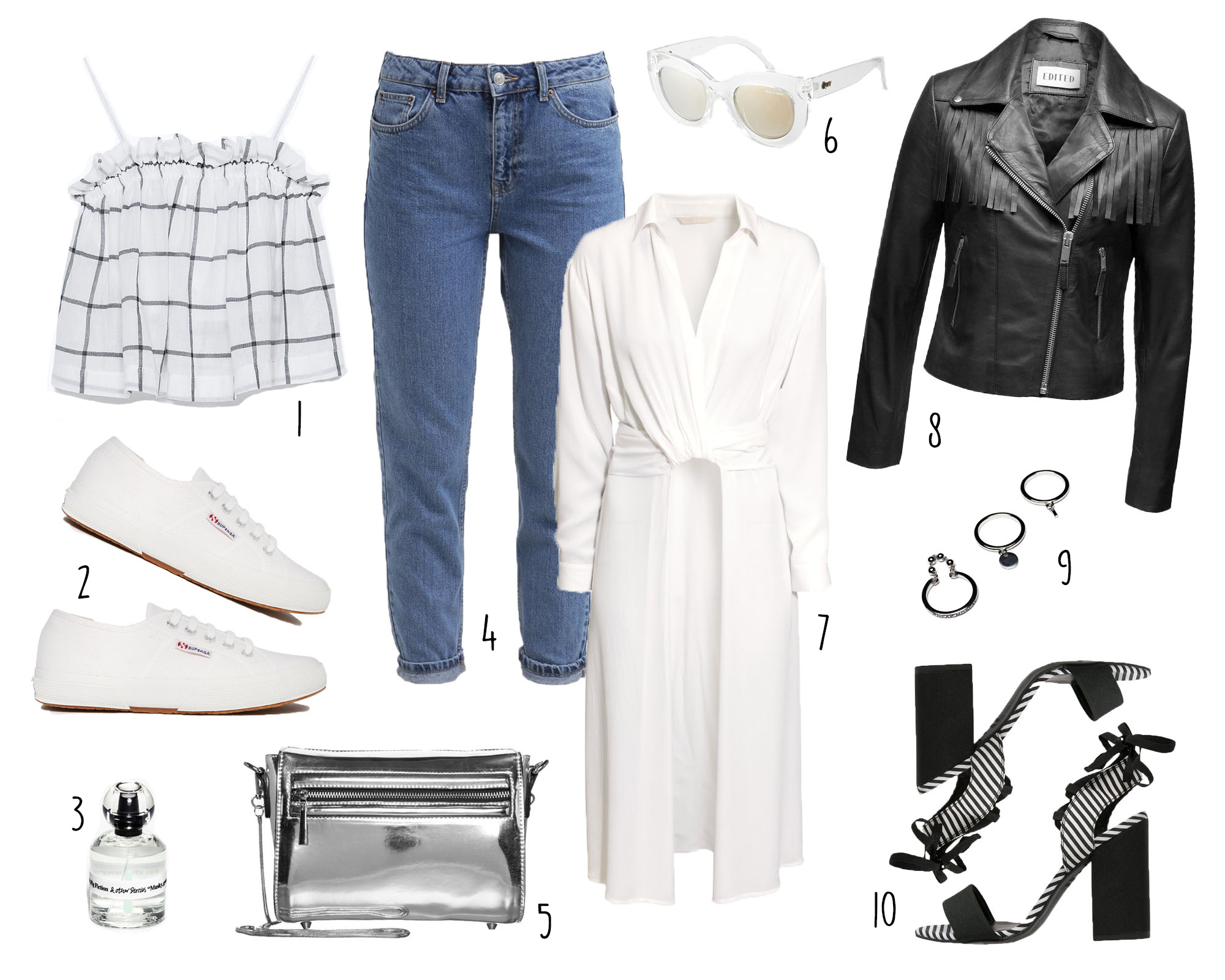 monthly_wishlist-may-2   1. Zara – Checked Top with spaghetti straps 2. Superga – Cotu Classic Sneaker in white 3. & Other Stories – “Fig Fiction” Eau de Toilette 4. Topshop – High waisted Mom-Jeans 5. Zign – Zipped Crossbody Bag in silver 6. Asos – Sunglasses with transparent sides 7. H&M – Long blouse with draped front 8. Edited – Leather jacket with fringes 9. Weekday – Set with 3 rings 10. New Look – Striped lace-up heels