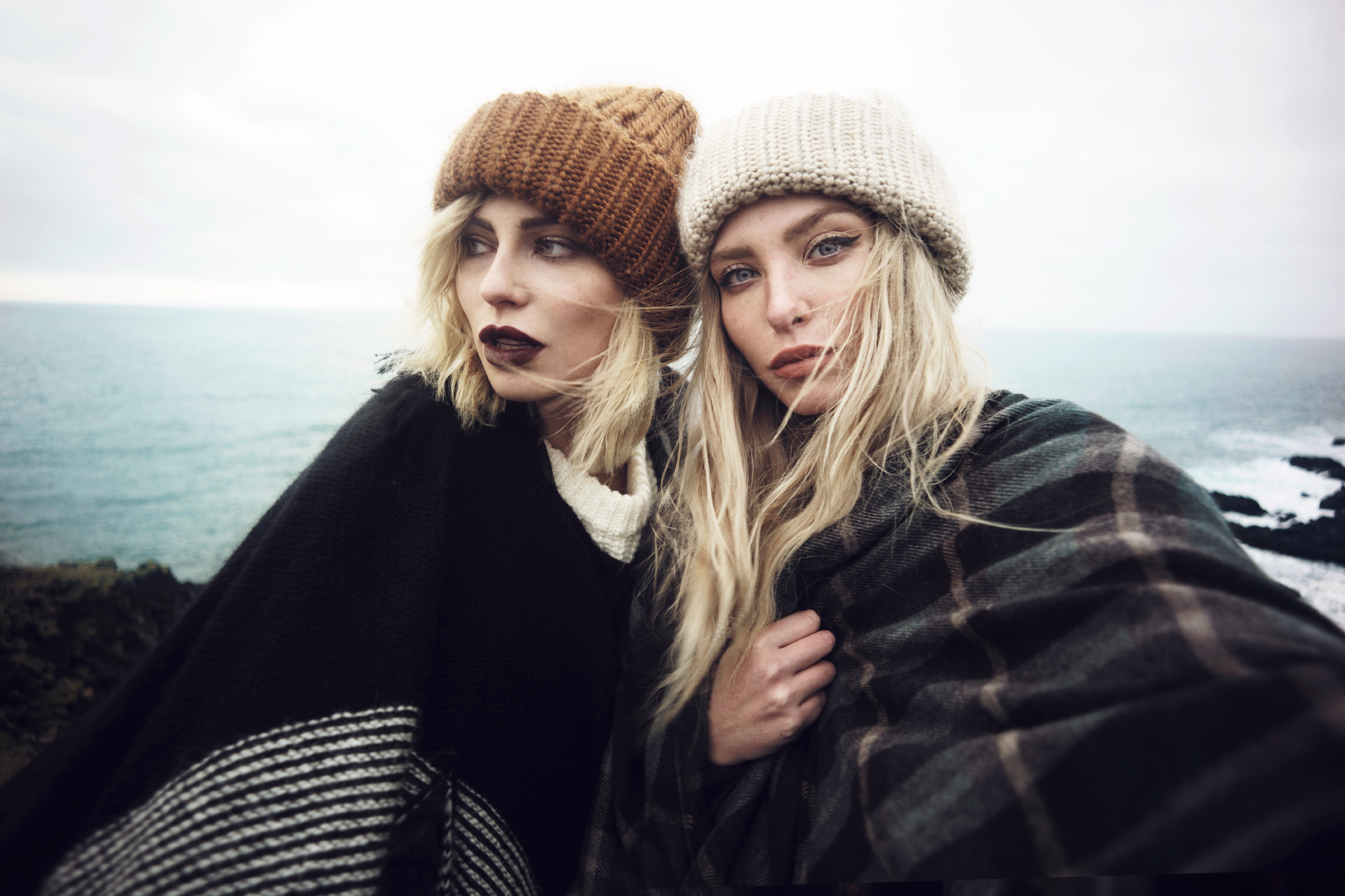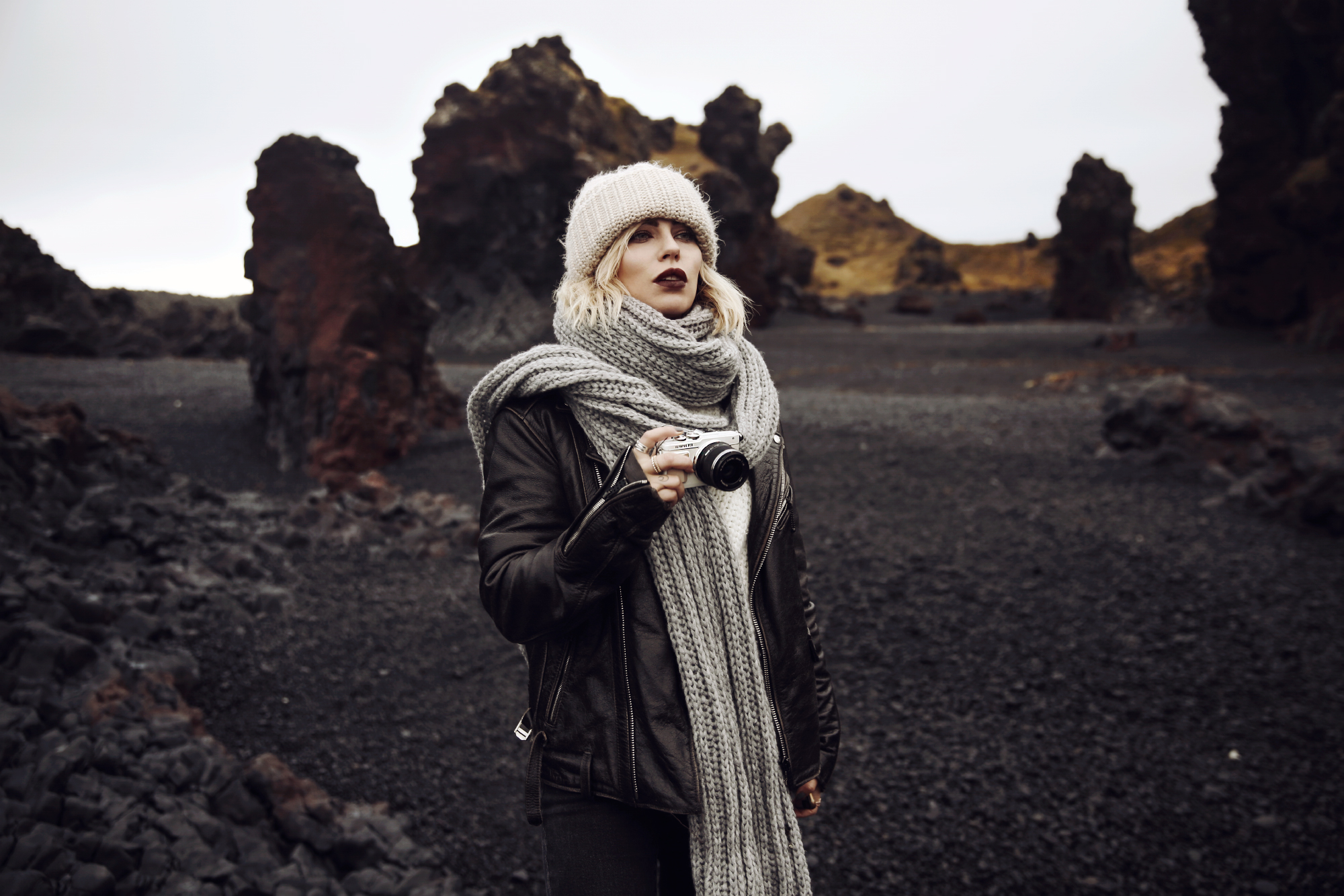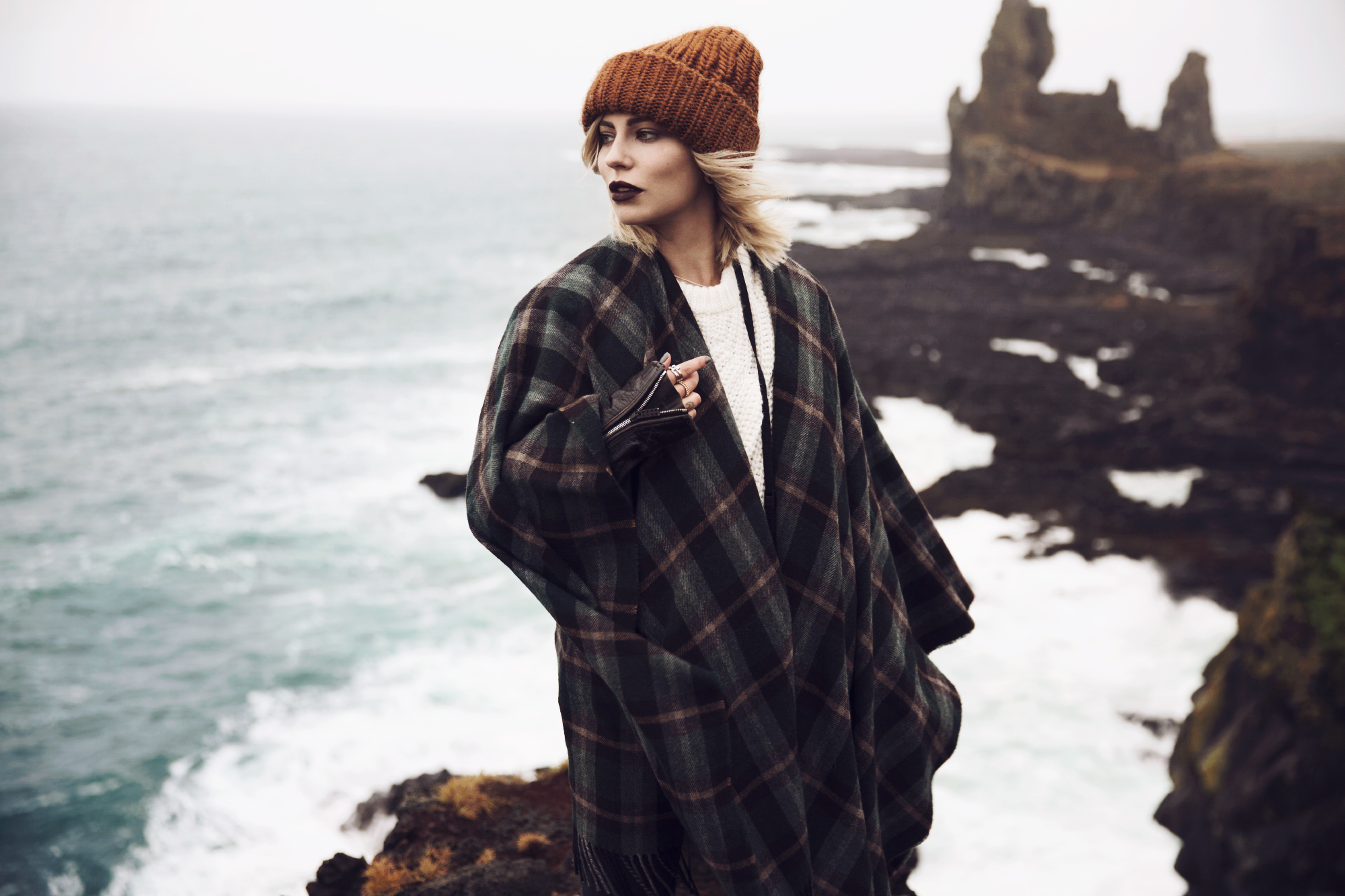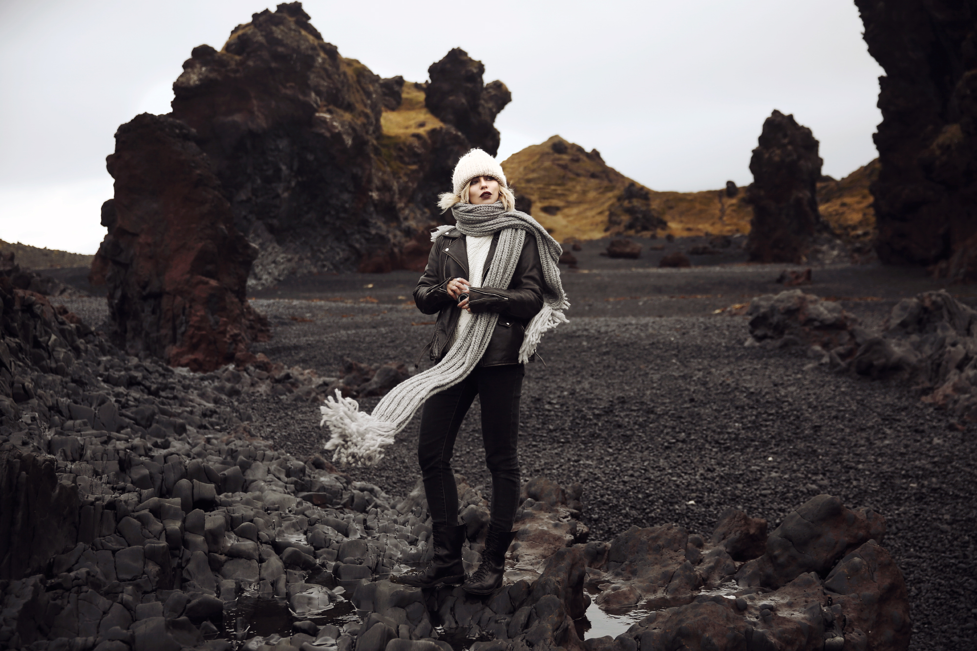 Die Wolken bewegten sich in so einer Geschwindigkeit, dass einem schwindelig wurde, wenn man zu lange in den Himmel geschaute und überall aus der Erde dampfte und köchelte es. Die Erde ist lebendig. An kaum einem Ort merkt man es so sehr wie dort. Island bringt Natur sogar den Menschen nah, die sich sonst nicht so sehr dafür begeistern könnten – aus ästhetischen Gesichtspunkten. Und so verliebte ich mich trotz Sturm und schlimmen Wetterbedingungen in Island. Doch zurück zu unserer Route: zuerst umkämmten wir das Gebiet um den Flughafen herum, u.a. Gunnuhver und Reykjanes und kehrten dann nach Reykjavik zurück. Am nächsten Tag ging es schon ganz früh morgens Richtung Süden zu einem alten Flugzeugwrack, oder besser: Lina prügelte mich um 5:30 aus dem Bett, fuhr mit mir zwei Stunden Auto und latschte mit mir 4 km bei Wind und Wetter zur Location, wo wir dann ohne Touristen mit Neonjacken fotografierten. Das Problem war: nach dem Shooting mussten wir natürlich wieder die 4 km zum Auto latschen, aber was bleibt einem übrig? Es war grade mal 10 Uhr morgens und ich war schon vollkommen erledigt. Anschließend fuhren wir an der Südküste entlang, vorbei an dem Vulkan, der jederzeit ausbrechen sollte (mulmiges Gefühl) und an zig Wasserfällen, bis wir schließlich den Diamond Beach erreichten und die Gletscherlagune. Leute, das war vielleicht ein Ausblick! Ich stand einfach nur da, mit offenen Mund und konnte die Schönheit kaum begreifen. Wir haben dort auch einen Look geschossen – ich könnte kaum schärfer drauf sein ihn mit euch endlich zu teilen. Irgendwo bei Jökursalon haben wir uns dann ein Plätzchen zum Schlafen gesucht, denn am nächsten Morgen wollten wir wieder früh raus und es vorzugsweise zurück bis nach Reykjavik schaffen. Die Unwetterwarnungen waren keine Untertreibung. Es war wirklich die Hölle: es schüttete wie aus Eimern und so verbrachten wir den nächsten Tag relativ unspektakulär. Wir schossen nur einen Beauty Look, in dem wir mich so platzierten, dass ich vom Autodach geschützt war und Lina aus dem Auto heraus schießen konnte. Not macht eben erfinderisch. Erstaunlicherweise ist der Look dennoch ziemlich cool geworden und wir konnte ruhigen Gewissens weiterfahren.