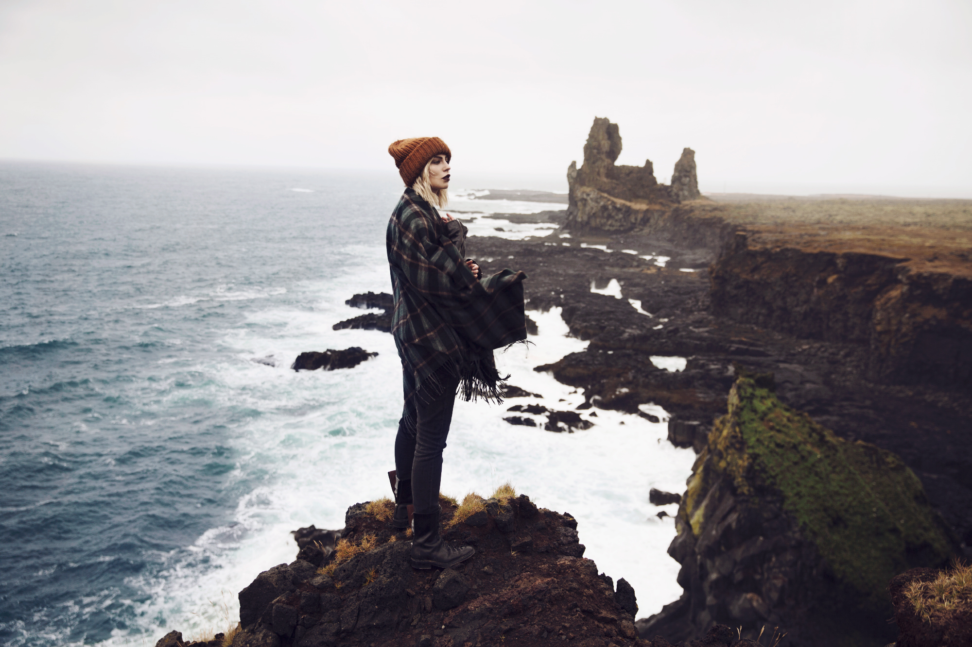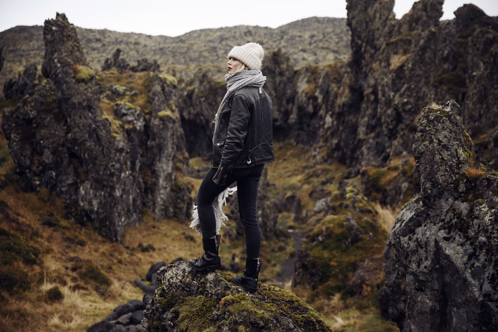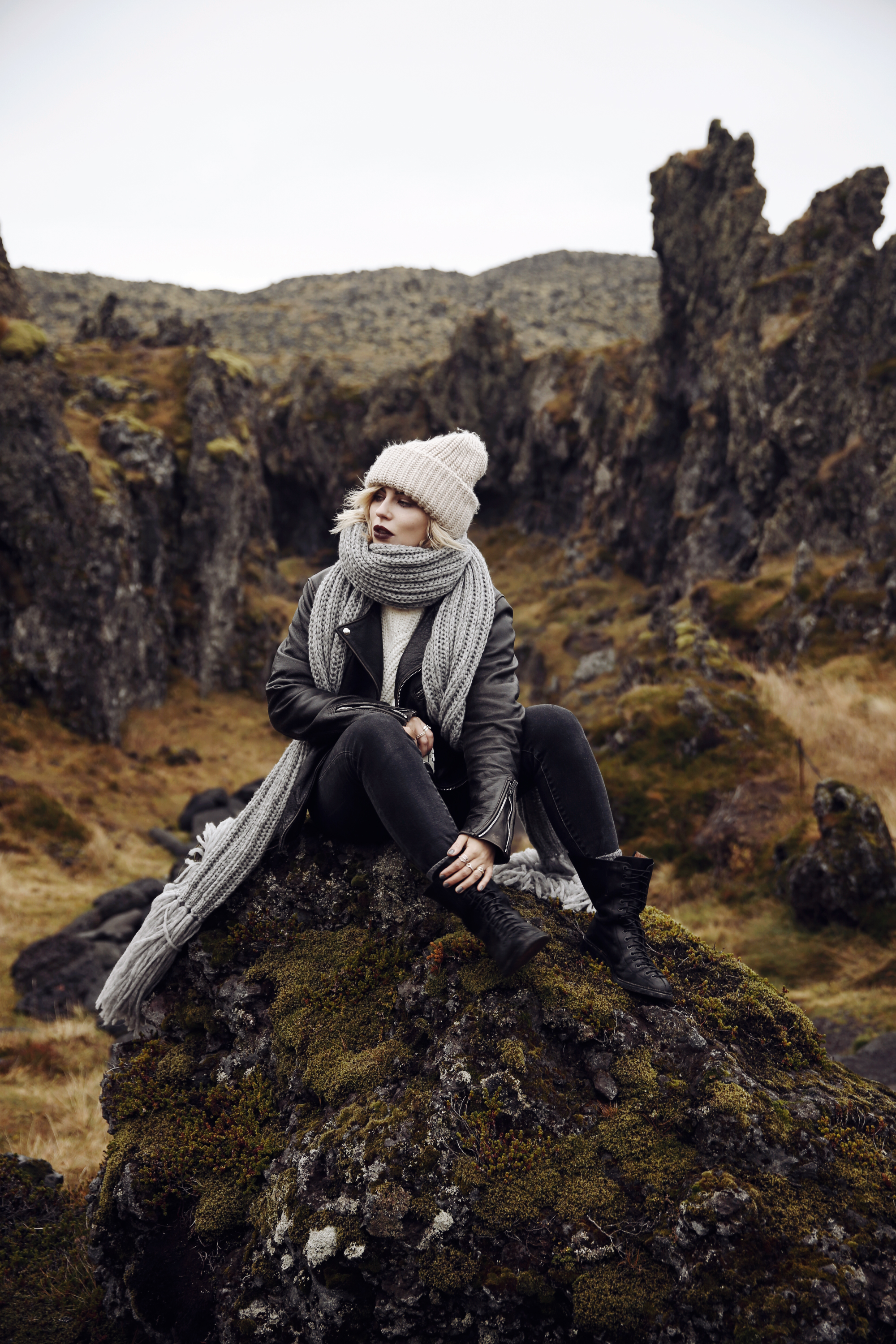 Durch diesen Sturm verbrachten wir 99% unserer Reise im Auto, denn sobald wir es verließen, waren wir innerhalb von Sekunden klatschnass. Es hat einfach Badewannen-Ladungen geregnet, gepaart mit einem Wind, der mich fast davongeweht hat, wenn ich mich nicht irgendwo festhielt. Wenn es dagegen nur etwas heftiger genieselt hat, verließen wir das Auto und machten schnell ein paar Bilder. Dabei hat sich herausgestellt, dass Braids meine absolute Lieblingsfrisur für Island ist, denn alles andere funktionierte einfach nicht. Ständig wurde es weggeweht oder nass und dadurch unbrauchbar – allerdings auch nur bei mir. Das ist einfach so typisch: schon während des mybestbrands Shootings haben wir Witze darüber gemacht, dass ich von einer Regenwolke verfolgt werde, die sich immer nur ausgerechnet dann auslässt, wenn ich grade shooten möchte. Es war fast schon kurios, denn sobald Lina ein anderes Motiv hatte blieb es trocken, sobald ich wieder dran war ging es los. Deswegen bin ich übrigens auch die Einzige, die komplett nass ist bei ihren Bildern und auch bei den anderen Bildern bin ich öfter nass, als trocken. Naja, es passt wenigstens zur Stimmung habe ich mir dann gesagt. Generell habe ich in der Zeit festgestellt, dass das Wort „shooten“ allein schon ausrecht, um die Wetterverhältnisse rapide zu verschlechtern. Immer, wenn ich mich nämlich zurecht gemacht habe und bereit war fing es entweder plötzlich an zu regnen oder die Sonne kam raus und strahlte so intensiv, dass die ganze Stimmung flöten ging. Ihr müsst nämlich wissen, dass Island zu den wenigen Destinationen gehört, die bei Mittagssonne ein bisschen was von ihrer Schönheit einbüßen müssen. Wenn es dagegen ein bisschen bewölkt, vorzugsweise auch nebelig ist, entfaltet Island erst seine gesamte Schönheit und zeigt sich von seiner besten Seite. Aber das war nur mein persönliches Empfinden. Ich mag Mittagssonne einfach nicht und in Island schon gar nicht. Aber sobald ein paar Wolken die Sonne verdeckten bekam Island auf einmal eine besondere Stimmung, fast schon mystisch könnte man sagen. Man muss dazusagen, ich bin nicht unbedingt das, was man allgemein als „naturverbunden“ bezeichnen würde. Ich bin ein Stadtkind. Ich kann mich nicht anhand natürlicher Zeichen orientieren, finde mich aber in jeder Metro der Welt zurecht. Bäume langweilen mich und in einen Wald bekommt man mich nur unter Klagen und Proteste. Ich sammle lieber Schuhe als Pilze. Trotzdem hat mir Island einfach den Atem geraubt, nicht nur wegen den Naturgewalten, den Bergen und seiner gesamten Schönheit, auch, weil viele der Unannehmlichkeiten, die Natur mit sich bringt in Island nicht existieren: es gibt kaum Insekten, kaum Bäume (dadurch eine weite Sicht) und kaum dieses grelle Grasgrün, das mich immer ein wenig an einen Greenscreen erinnert. Stattdessen: weite Sichten, tiefe Schluchten, ungewöhnliche Formen, viel Moos und noch mehr Gestein. Und das Beste: die meisten Dinge kann man easy abfahren und muss nicht extra stundenlang wandern.