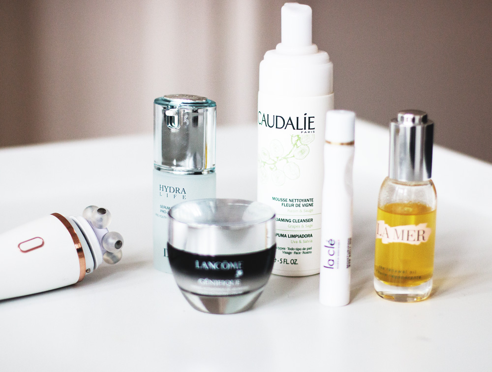 pflegeroutine-3 Mein Abendritual: Mein Abendritual ist um einiges kürzer, weil ich Abends meistens nicht mehr viel Lust auf Cremes & Co habe und stattdessen lieber schnell ins Bett will. Deswegen benutze ich meistens Reinigungstücher (ich habe da keinen Favoriten), um mein (Augen-)Make up gründlich zu entfernen und anschließend noch mal ein Gesichtwasser. Danach benutze ich mein Renewal Oil von La Mer, das etwas länger braucht bis es vollständig eingezogen ist (je nach Menge) und deswegen idealerweise abends aufgetragen wird, da es über Nacht perfekt einziehen und wirken kann.   Sonst so: Wenn ich morgens mal etwas länger Zeit habe benutze ich sehr gerne Masken. Zur Zeit am liebsten die von Caudalie, die man untereinander auch mixen kann (zB. die Feuchtigkeitsmaske für die Wangen und die Detoxmaske für Stirn, Nase und Kinn.) oder die Moisturizing Face Mask von la clé, die anfangs etwas gruselig aussieht, aber eine krasse Wirkung hat und die Haut danach wie neu erstrahlt.