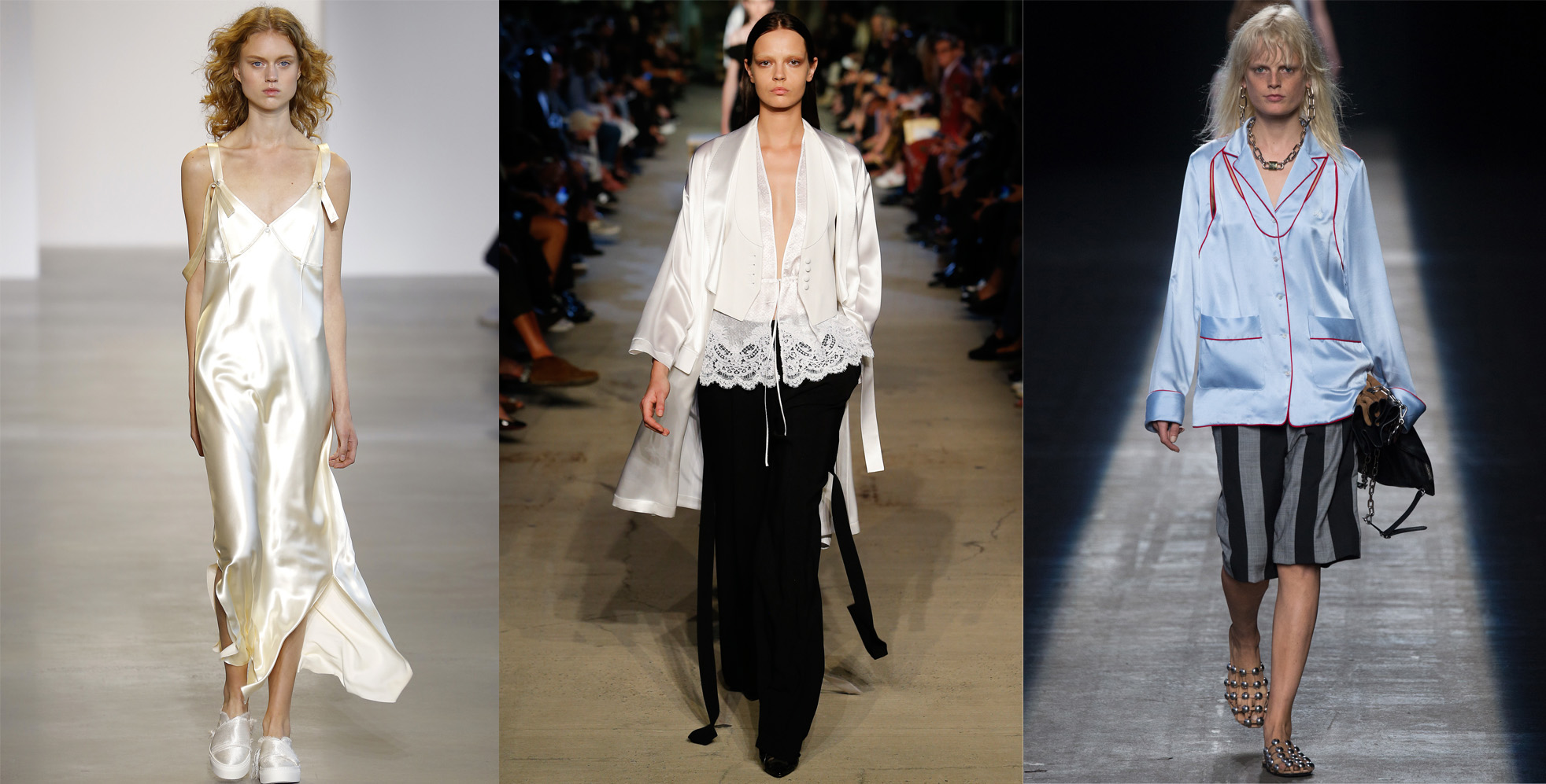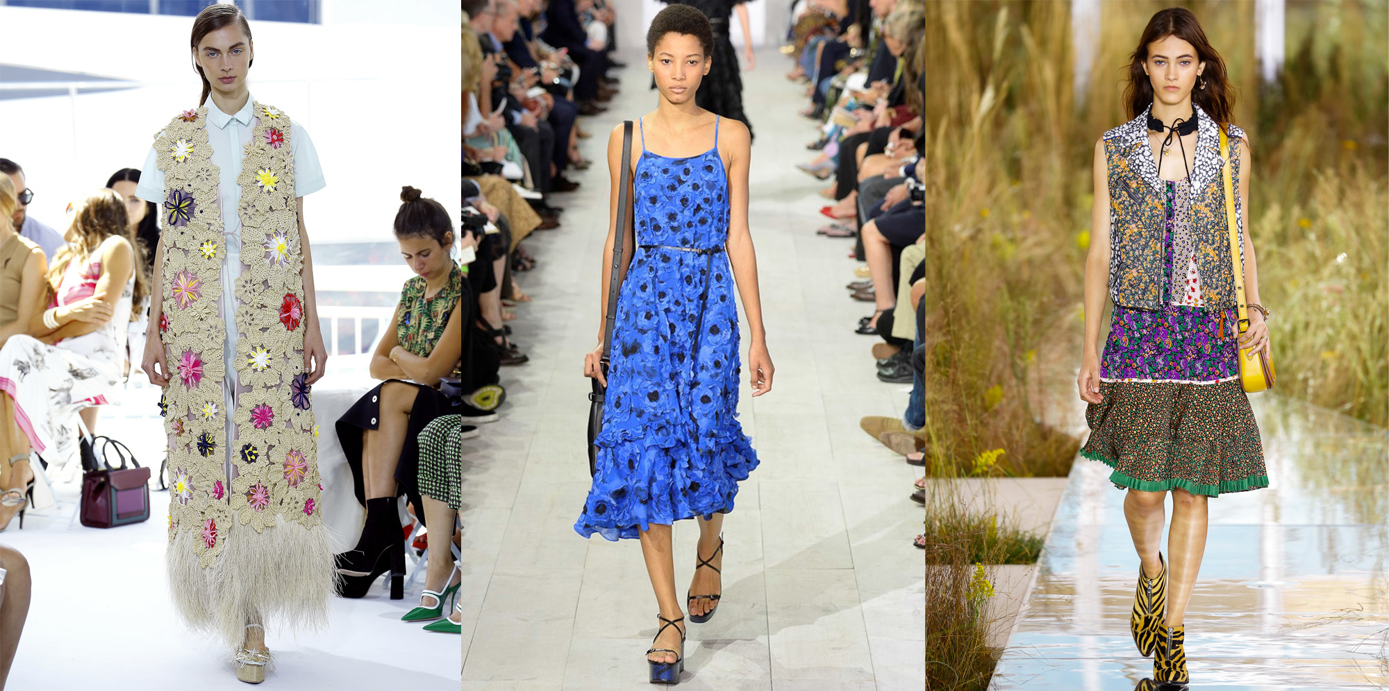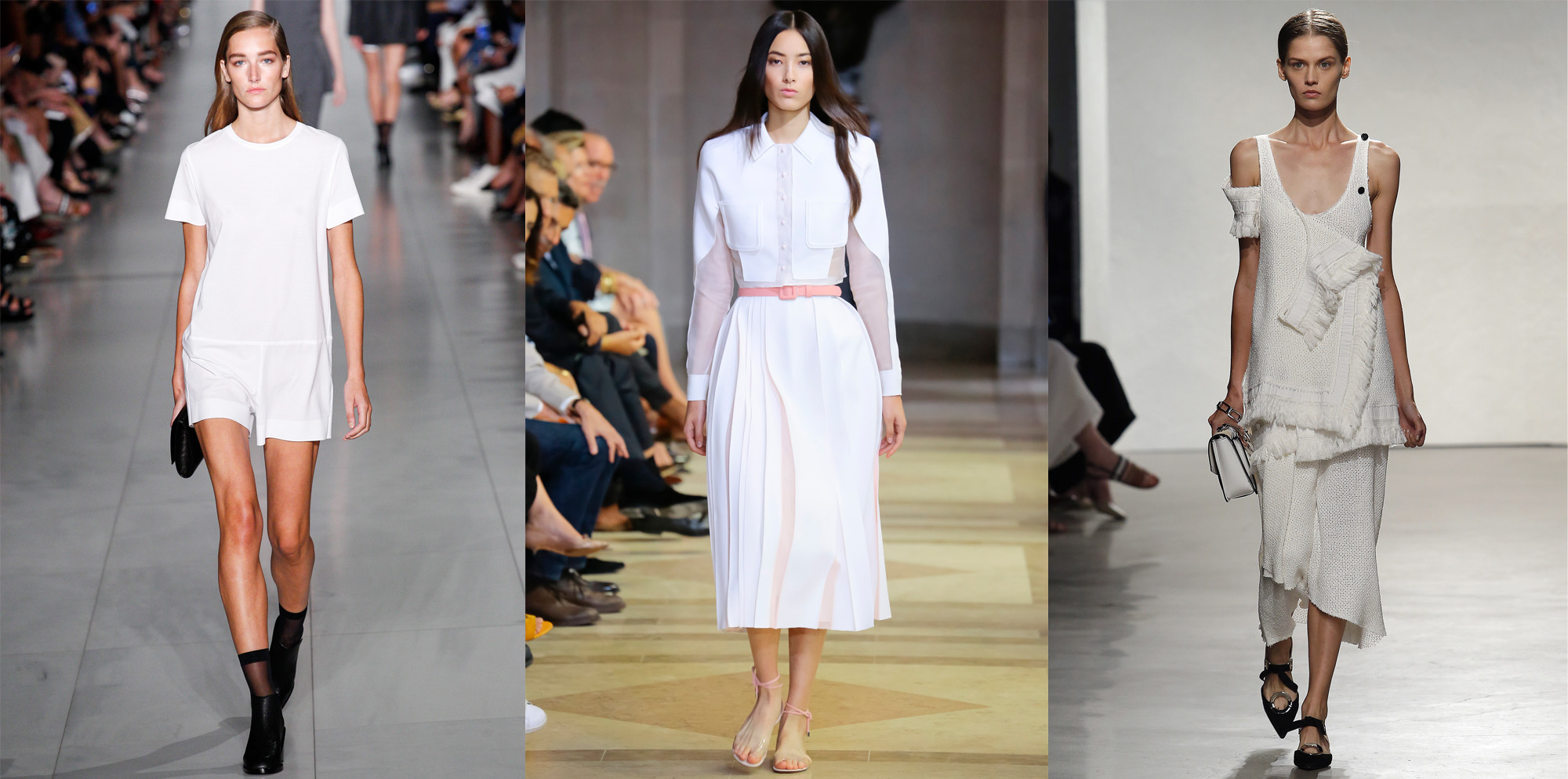 Stripes streifen From left: Ralph Lauren, Tanya Taylor, J.Crew und Tommy Hilfiger It’s not all about the marine look, there’s more to stripes. Like colors! While Ralph Lauren stays true to his classic line, new-comer Tanya Taylor shows colorful prints and complex cuts. Favorite: the stylish off.shoulder top with flared trousers by J. Crew. Cool: Tommy Hilfiger presents a high-class two-piece with stripe pattern in the labels trademark colors blue and red.   Crop Top crop From left: Diesel, Thomas Wylde, Vera Wang With the current 90’s trend in full swing, we can expect a wave of crop tops coming our way next summer. However, the short tops will receive a makeover for the 2016 spring/summer season . Hip: Diesel goes rock with leather tops, while Vera Wang and Thomas Wylde use crop-tops in combination with long dresses and high cut shorts to create a very cool look.   Neo-romantic Blumen From left: Delopozo, Michael Kors, Coach We love flowers! The 2016 season will once again be a season of flowers and playful applications. Delpozo bets on extravagant shapes and extra-long vests, while Coach presents pieces with a hippie-chic edge.   Summer-white weiß From left: DKNY, Carolina Herrera, Proenza Schouler, Thomas Wylde What would summer be without looks in tender white? On the one hand we see Minimalistic designs by DKNY meet dresses and blouses in asymmetric cuts and airy textiles combined with midi-skirts as presented by Proenza Schouler and Caroline Herrera. Thomas Wylde impresses with transparent tops, very feminine blazers and leather lapel.   Pajama Fashion pyjama From left: Calvin Klein, Givenchy and Alexander Wang Last season the trend was barely emerging, next summer we will see it everywhere: pajama fashion in shape of silk dresses or light coats looking almost like gowns will all be among the must-haves next summer.   Orange orange From left: Altuzarra, Lacoste, Prabal Gurung Eye popping colors! Designers like Altuzurra, Lacoste and Prabal Gurung all go for one color in particular: orange! Color blocking? Forget it. The season’s favorite color is best presented full on in complete looks!   Laces rüschen-1 From left: Proenza Schouler, Marchesa, Tome Marescha made the dreams of many a girl come true and presented loads and loads of laces. Proenza Schouler and Tome skillfully incorporated lacy accents into long dresses with narrow waist belts and blouses with special cuts and low cleavages. Марафон моды – дубль первый! На прошлой неделе в Нью-Йорке завершилась Неделя моды, на которой были представлены новые коллекции сезона весна-лето 2016. Именно с Недели моды в Нью-Йорке начинается «марафон моды» – нас ожидает целый месяц, заполненный показами, интересными событиями и множеством вариаций уличного стиля. В ближайшие недели эстафету примет Лондон, затем Милан и, наконец, Париж. В Instagram полно вдохновляющих фотографий с первых показов, и первые тенденции уже определены. Сегодня я хочу рассказать вам о самых ярких моментах Недели моды в Нью-Йорке:
